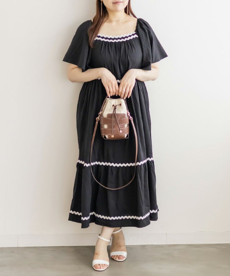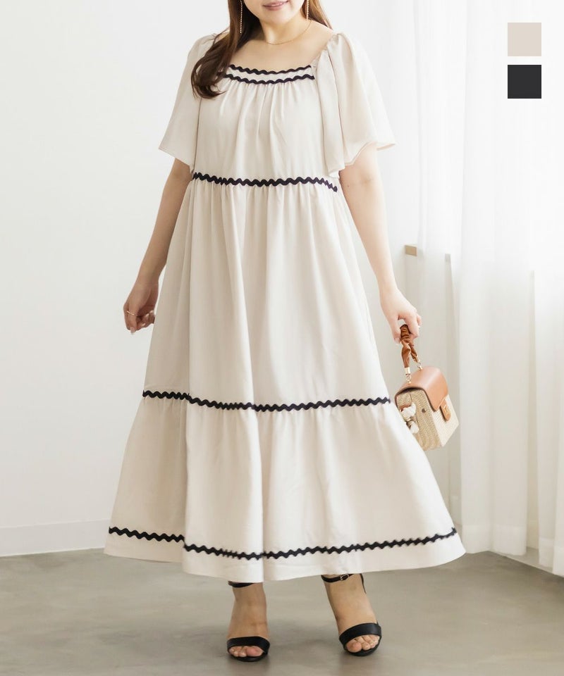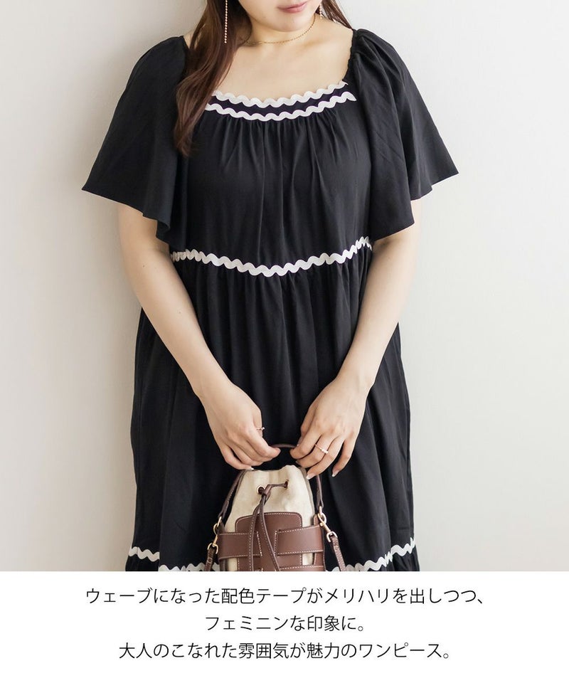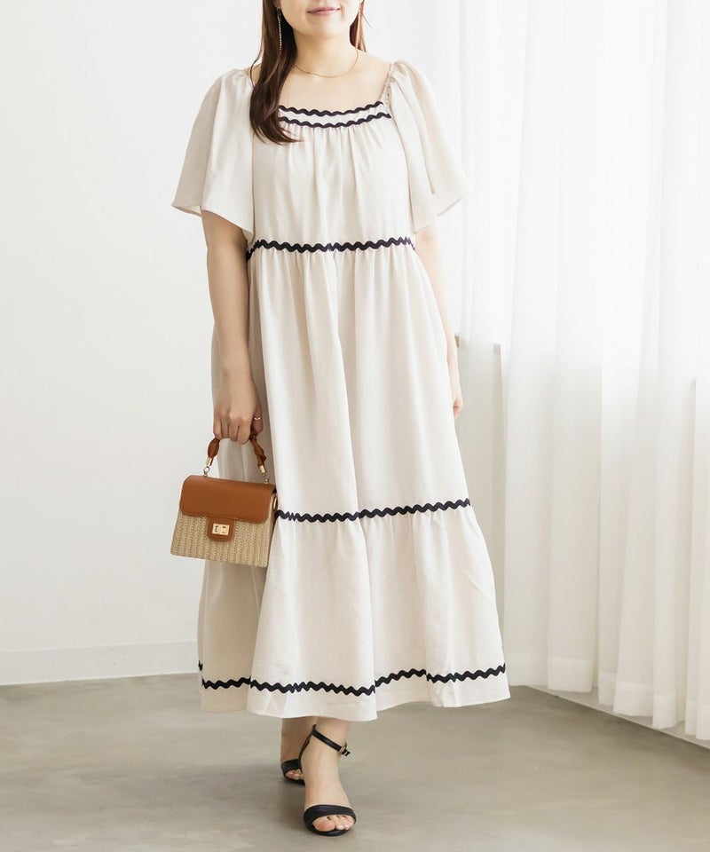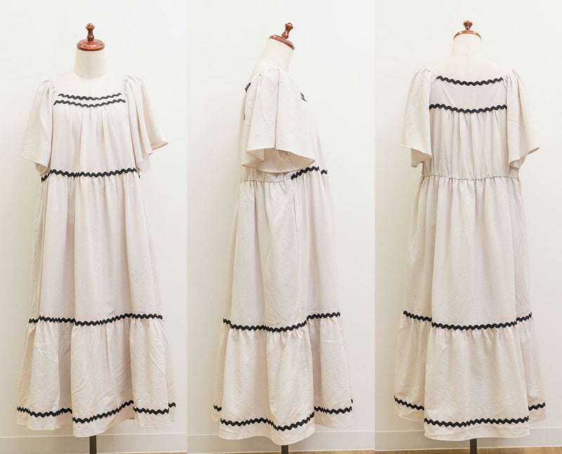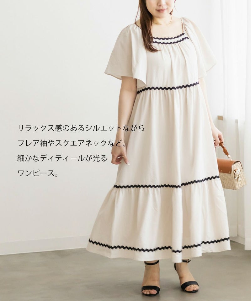 3Lサイズを着用しましたが、程よくゆとりがあり、リラックスして着られました◎ ティアードデザインがボディラインをふわっとカバーしてくれて、体型を気にせず楽しめるのが嬉しいポイント♪ 配色テープが効いていて、1枚でしっかりおしゃれ見え!肩まわりのラインもすっきりしていて、羽織いらずでコーデが決まる、主役ワンピースです。