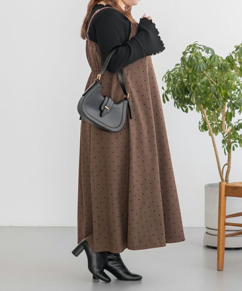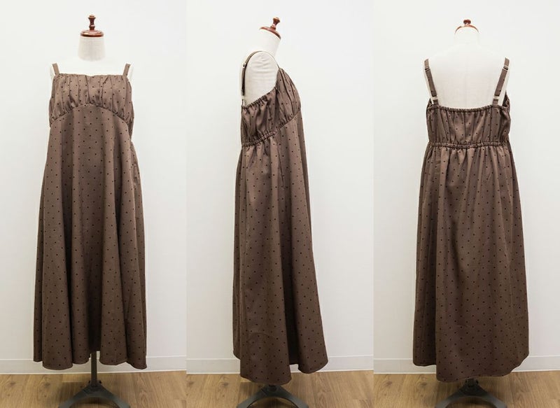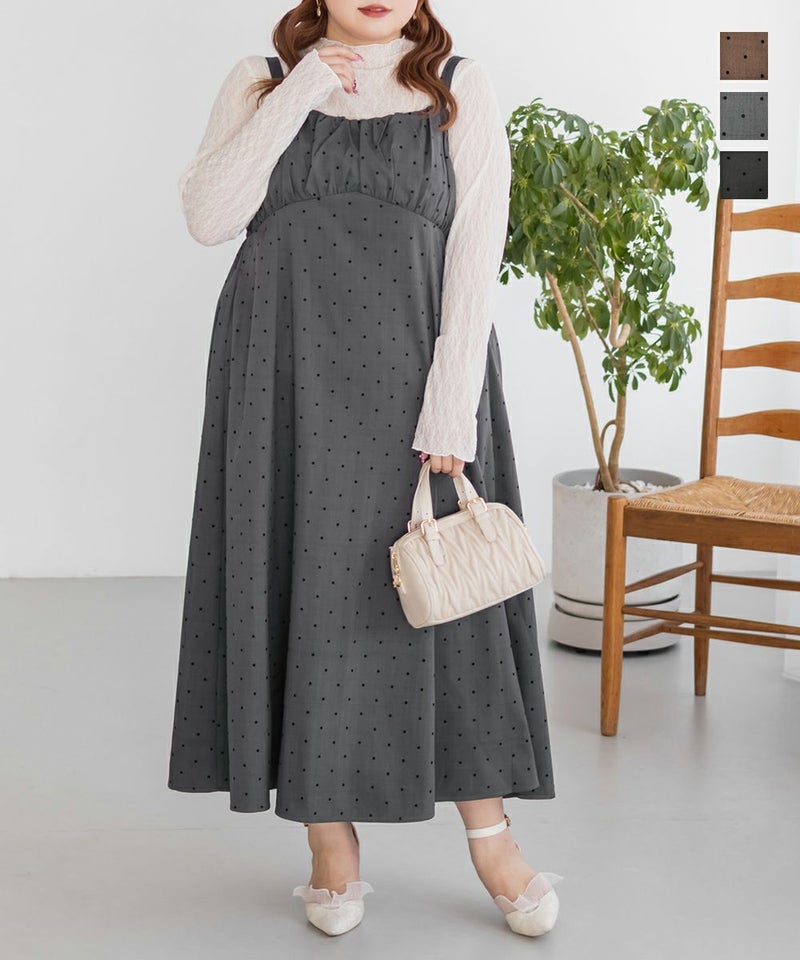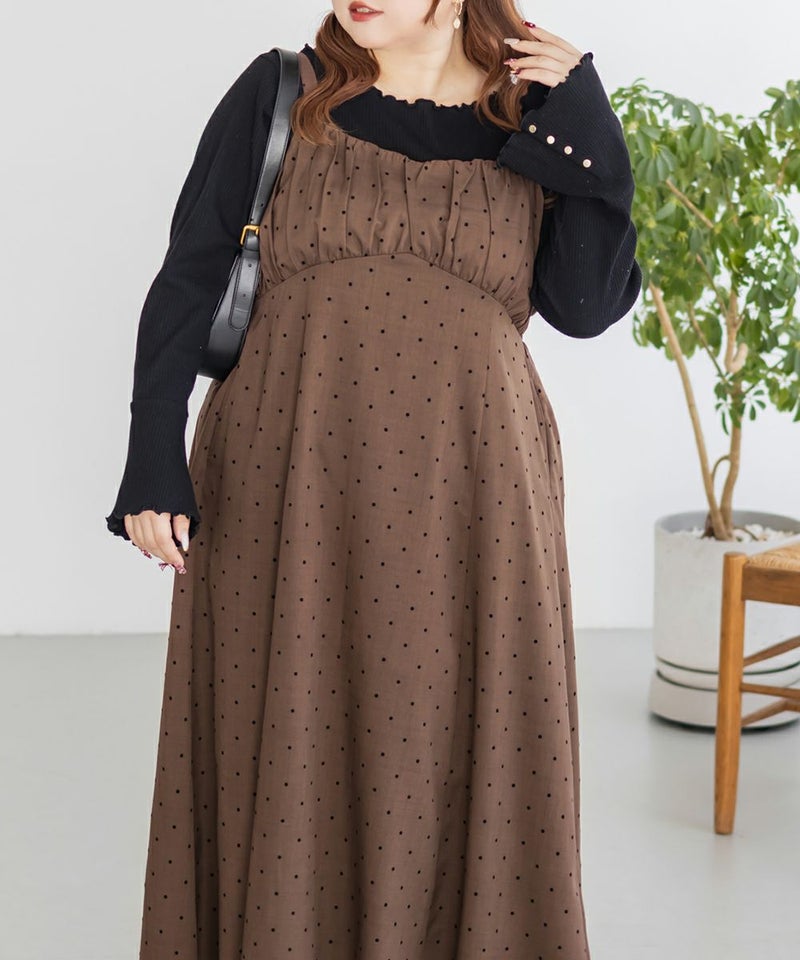 3Lサイズを着用して丁度良い着心地で、いつも通りのサイズで問題なく着用出来ました。後ろはゴム入りなのと、肩紐は調節できる仕様で、ストレスフリーな着心地です。生地もさらっとした感じで重さも少なくオールシーズン着られる1枚。胸元は今っぽいギャザーがあしらわれたデザインで、バストをコンパクトに見せてくれます。胸下に切り替えがあるので足が長くスタイルアップして見えました!トレンドのドット柄のワンピースは今季持っておきたいアイテムの一つです!落ち着いた色味なので、インナー次第で様々な着こなしが楽しめます♪