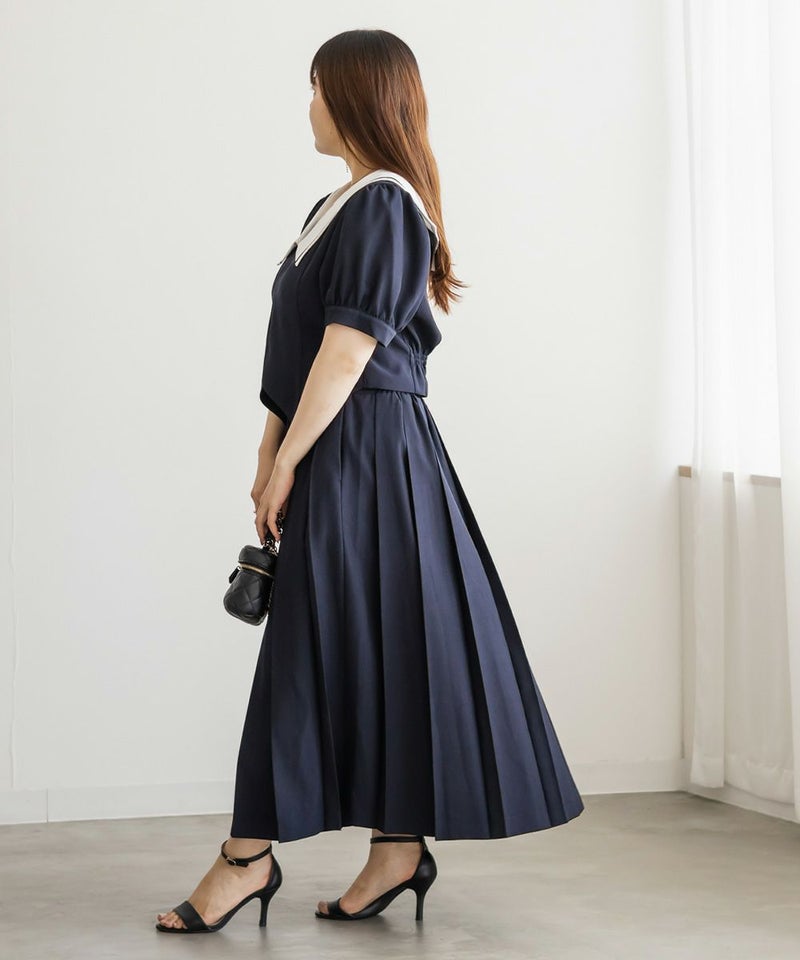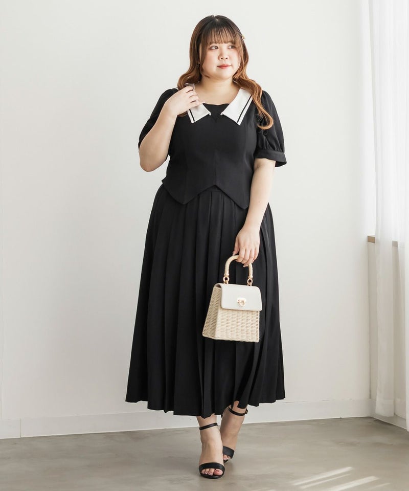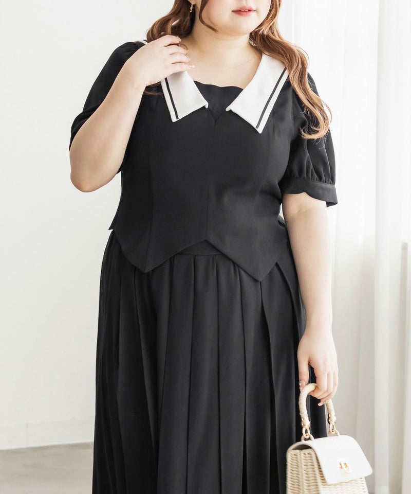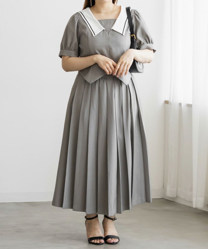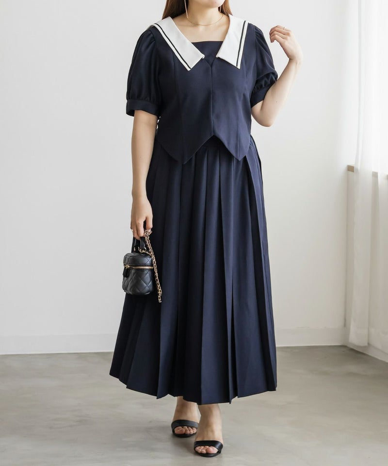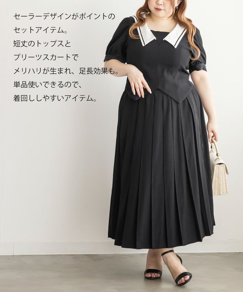 3Lを着てピッタリサイズでした。窮屈感はないけどすっきり見えるシルエットで着やせ効果抜群のアイテムです!セットアップだけでコーデが完成するので悩まず着られて嬉しい!セーラー襟は甘すぎないデザインなので大人かわいく着られて、プリーツスカートも広がりすぎずすっきりとした印象に。スカート・トップスともに後ろゴムでラクなのにきちんと感もあります。それぞれ単品でも着回しできて、1セットあるとたくさん活躍しそう◎着映えする1枚なので、写真をたくさん撮るシーンに良さそうです♪