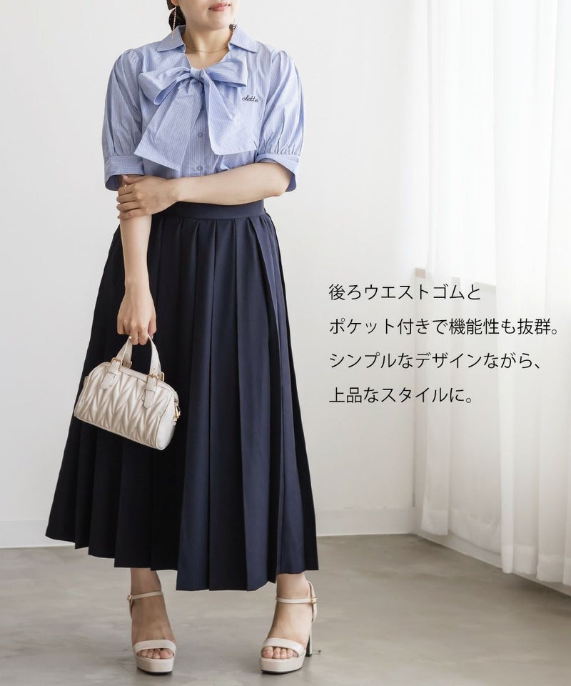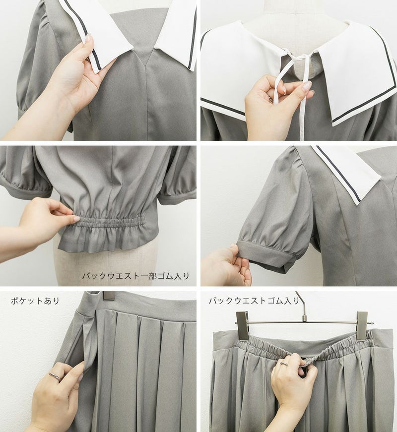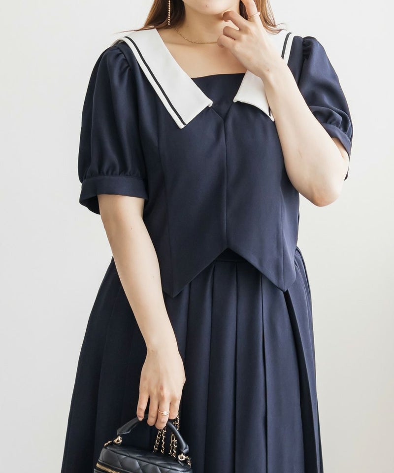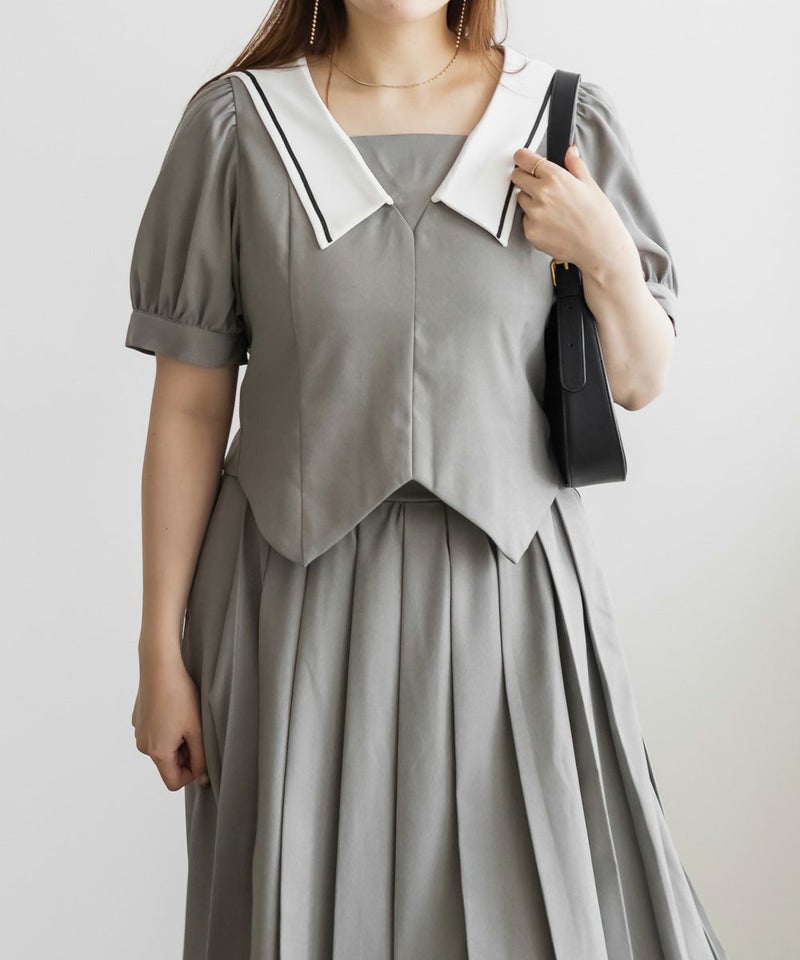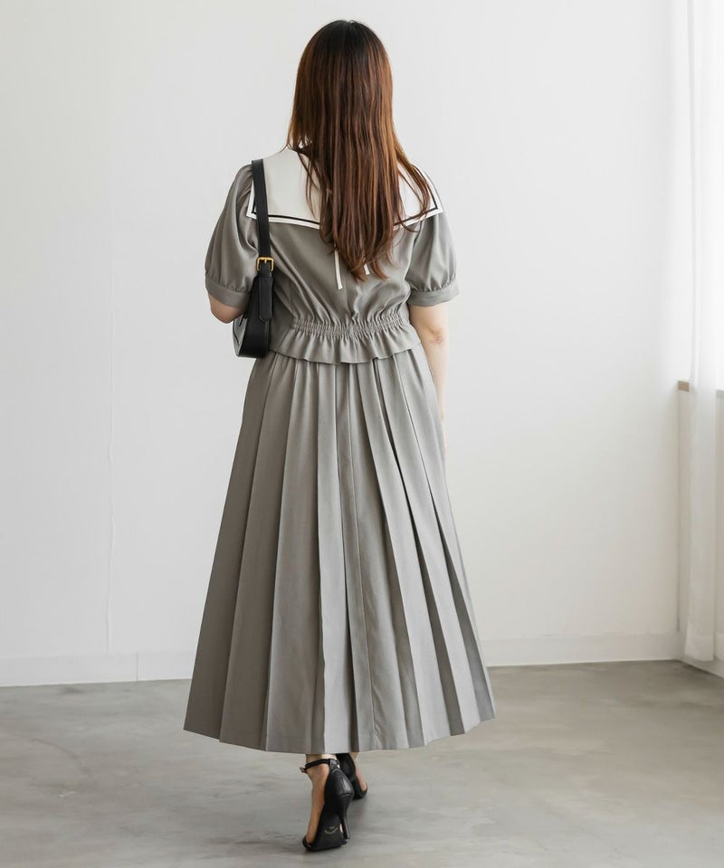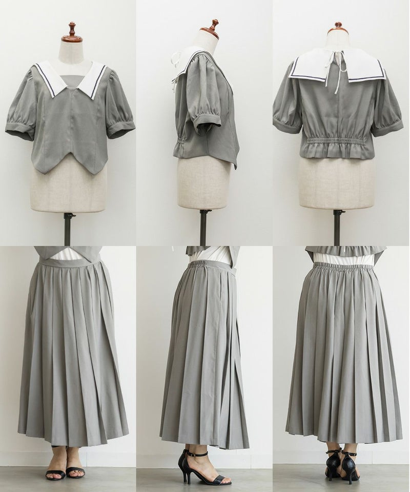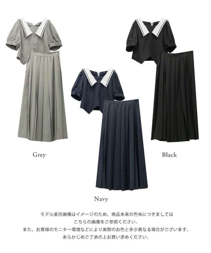 3Lを着てピッタリサイズでした。窮屈感はないけどすっきり見えるシルエットで着やせ効果抜群のアイテムです!セットアップだけでコーデが完成するので悩まず着られて嬉しい!セーラー襟は甘すぎないデザインなので大人かわいく着られて、プリーツスカートも広がりすぎずすっきりとした印象に。スカート・トップスともに後ろゴムでラクなのにきちんと感もあります。それぞれ単品でも着回しできて、1セットあるとたくさん活躍しそう◎着映えする1枚なので、写真をたくさん撮るシーンに良さそうです♪