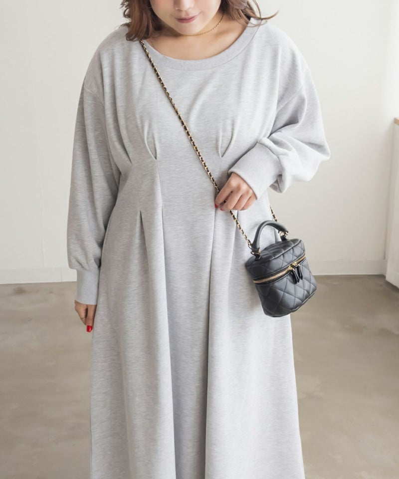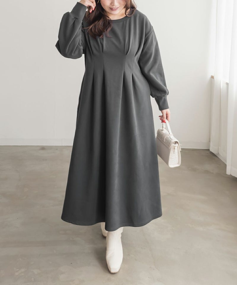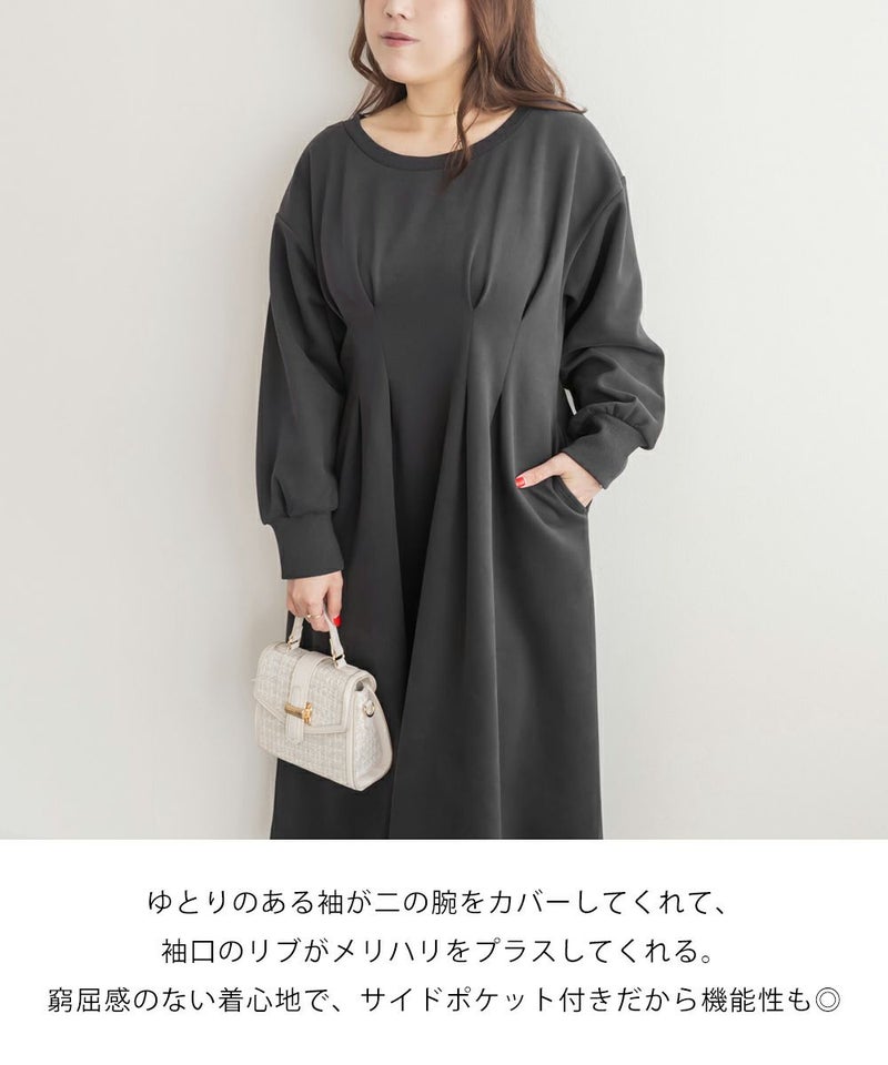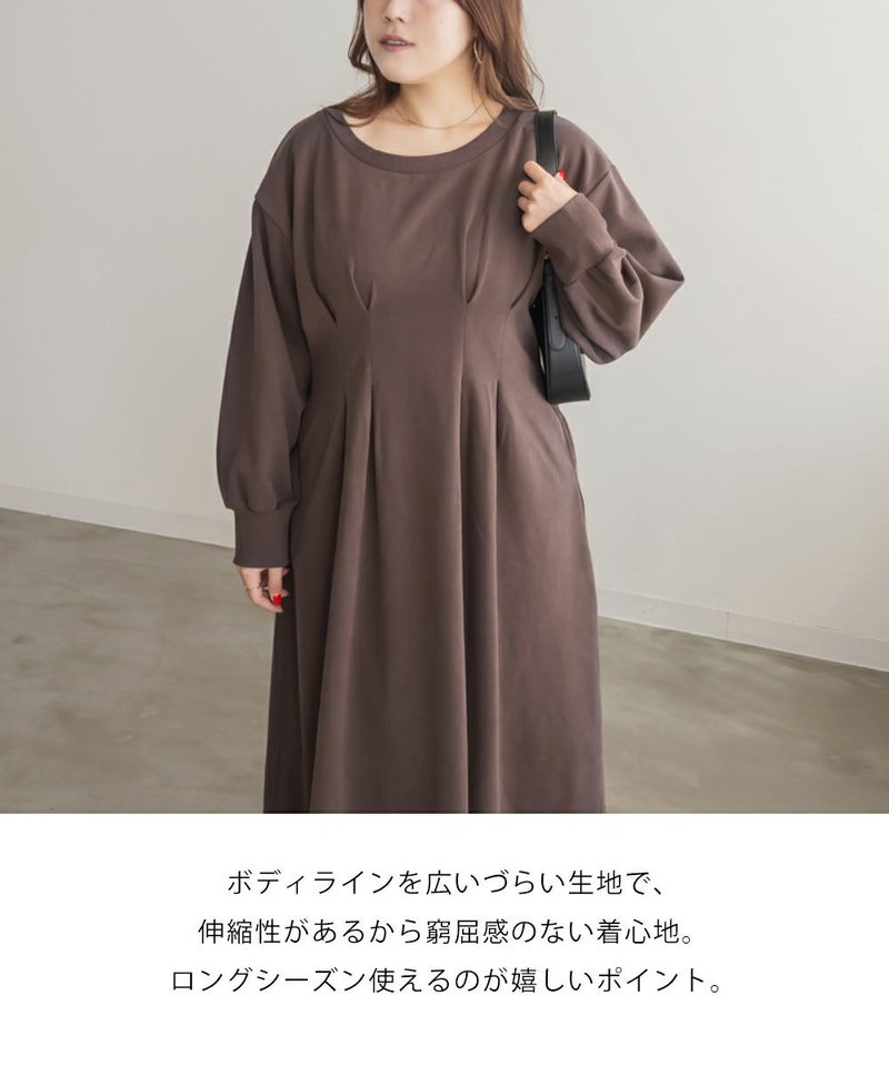 3Lサイズを着てちょうどよく楽な着心地でした!動きやすいスエット素材で着脱も楽々◎程よくハリのある生地なのでボディラインを拾わないのが嬉しい♪ウエストにタックが入っていて、フィット&フレアシルエットになってスエットだけど女性らしく着られます。ブーツやスニーカー、小物使いを変えるだけで違った印象に変化できます。頑張りすぎないおしゃれな雰囲気のスタイルをしたい方にぜひおすすめしたいです!