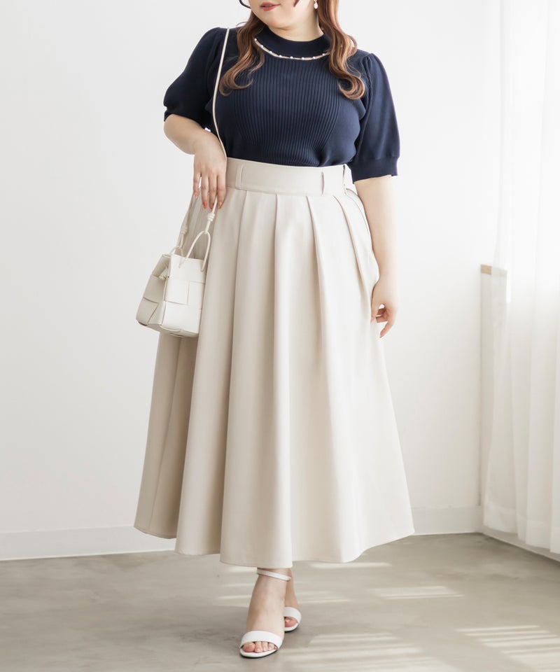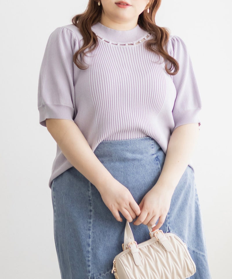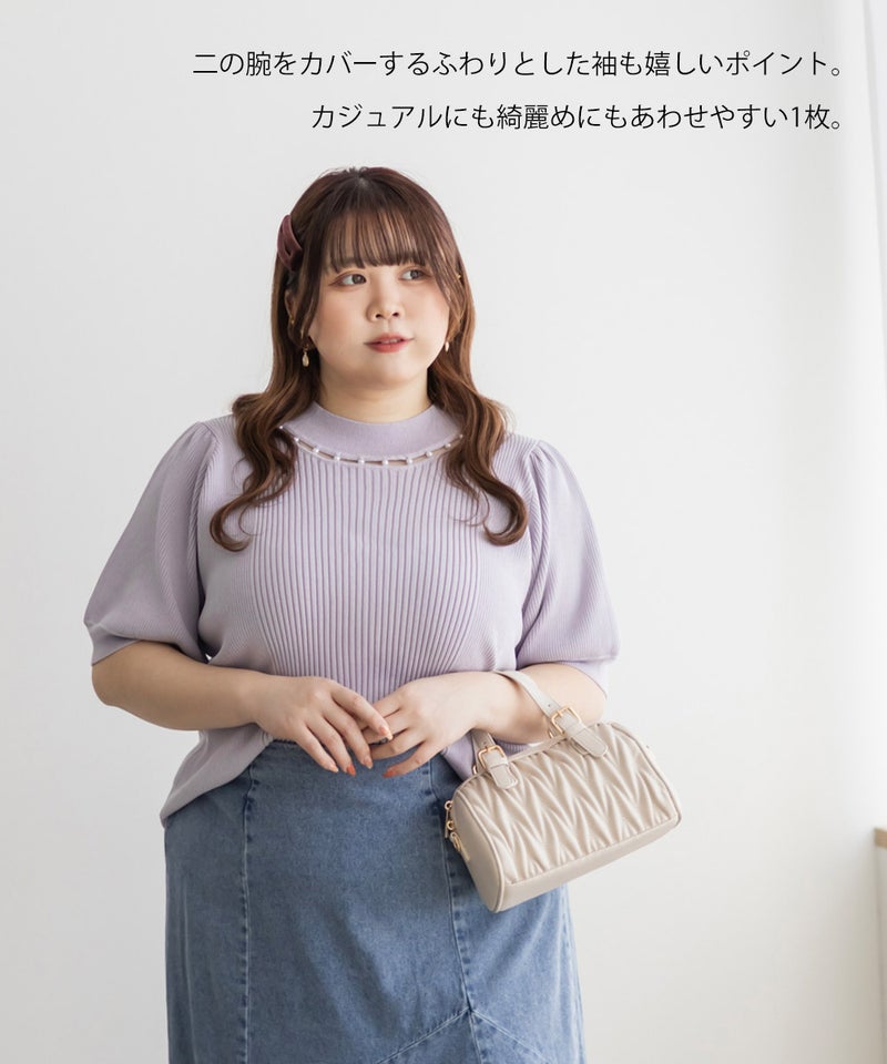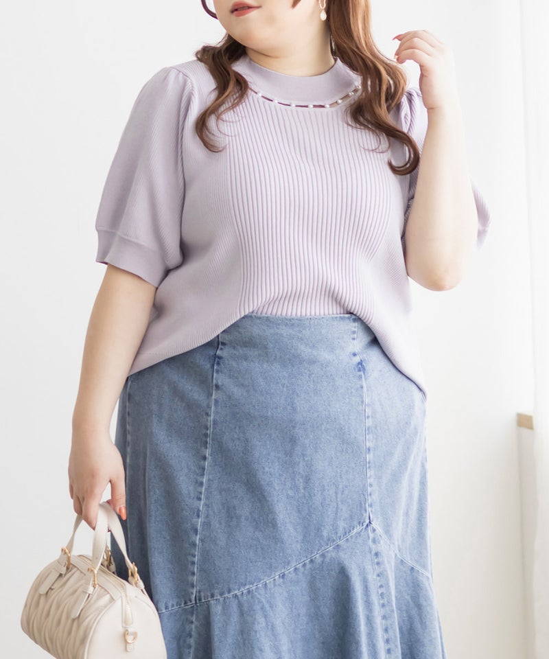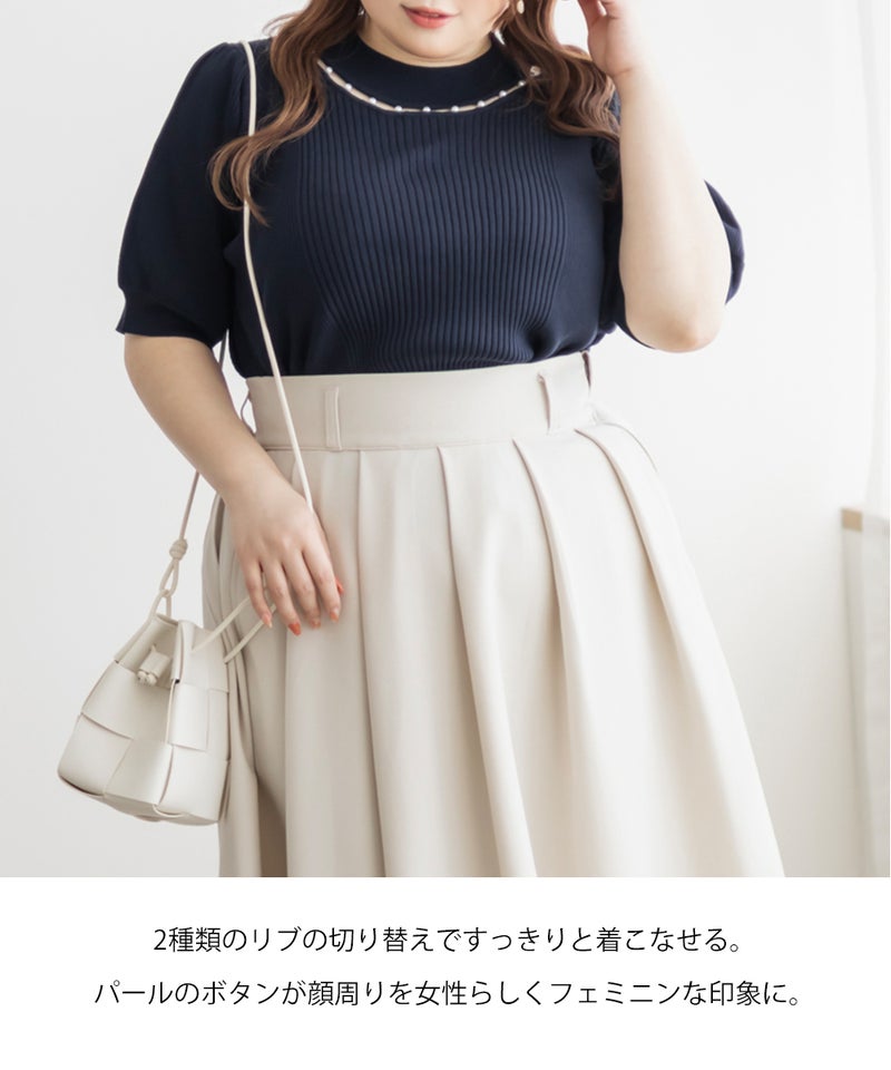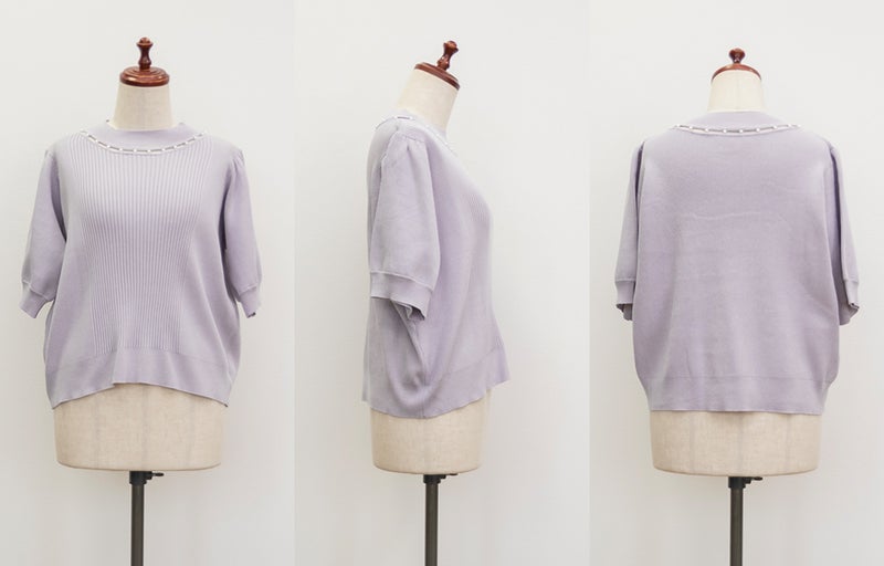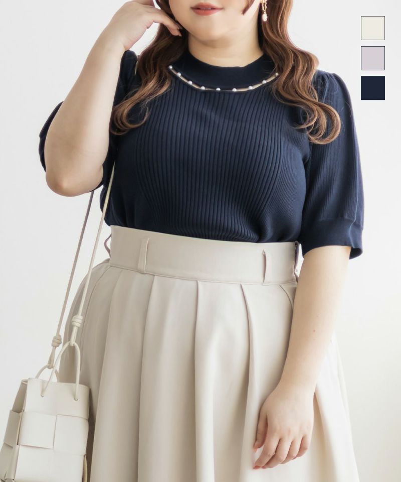 3Lサイズを着ていつも通りのサイズ感でした。首元にあしらわれたパールが華やかさをプラスしてくれて、アクセサリーいらずで一気に上品な印象に♪サマーニット素材なので身体にほどよくフィットして、着心地も抜群です◎チクチク感のない柔らかなニット生地で、長時間着ていても快適でした!袖口や裾もしっかりとしたつくりで、上品見えして、オンオフ着回ししやすいのも嬉しいポイント。着用感はちょうどよく、ジャケットやジャンスカのインナーとしても使いやすい万能アイテムです。