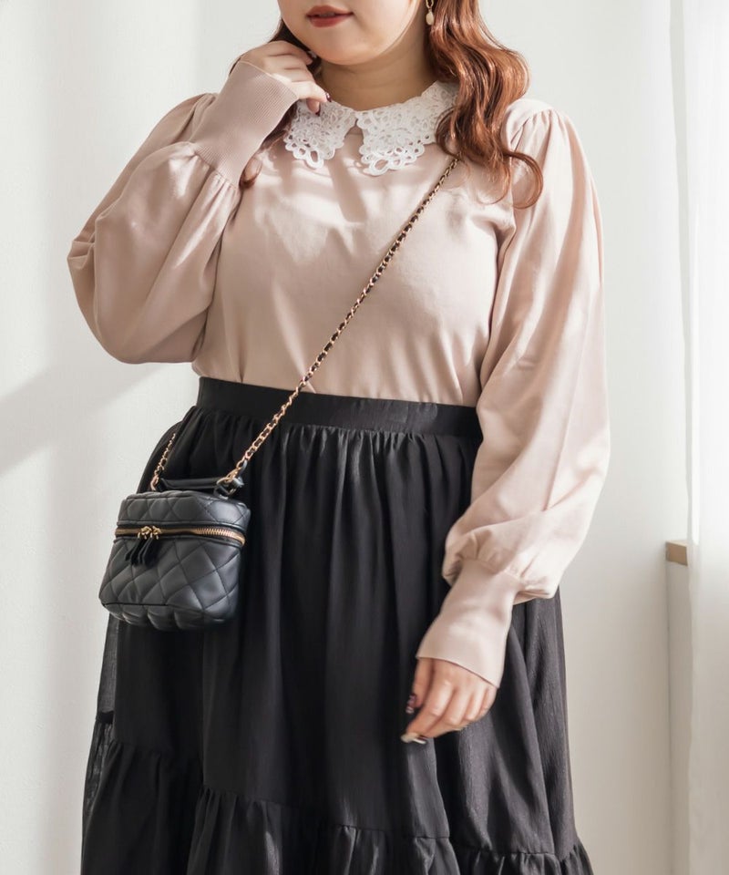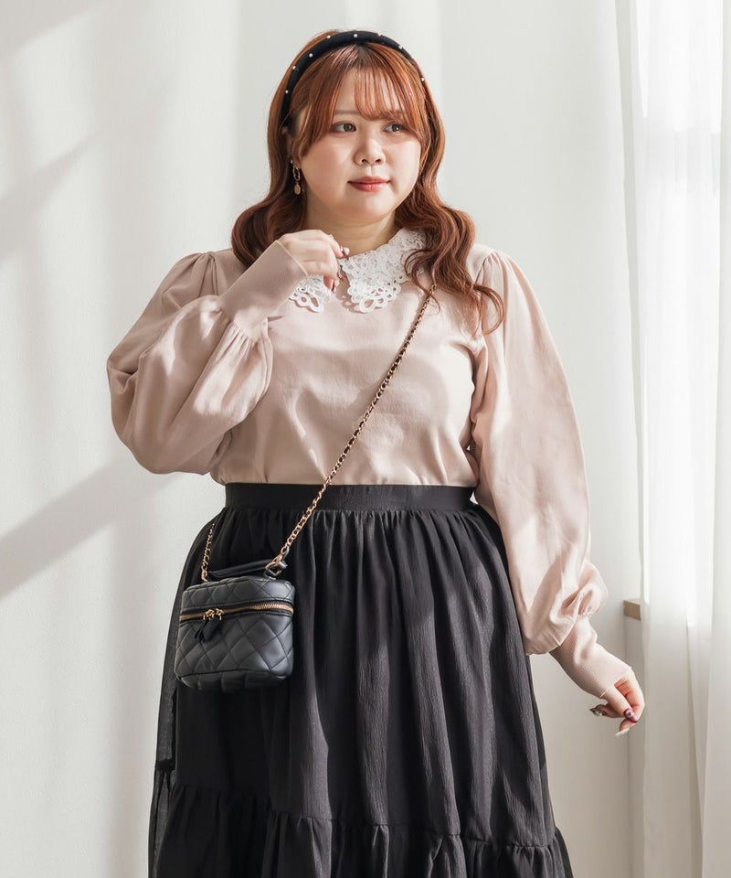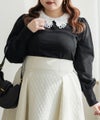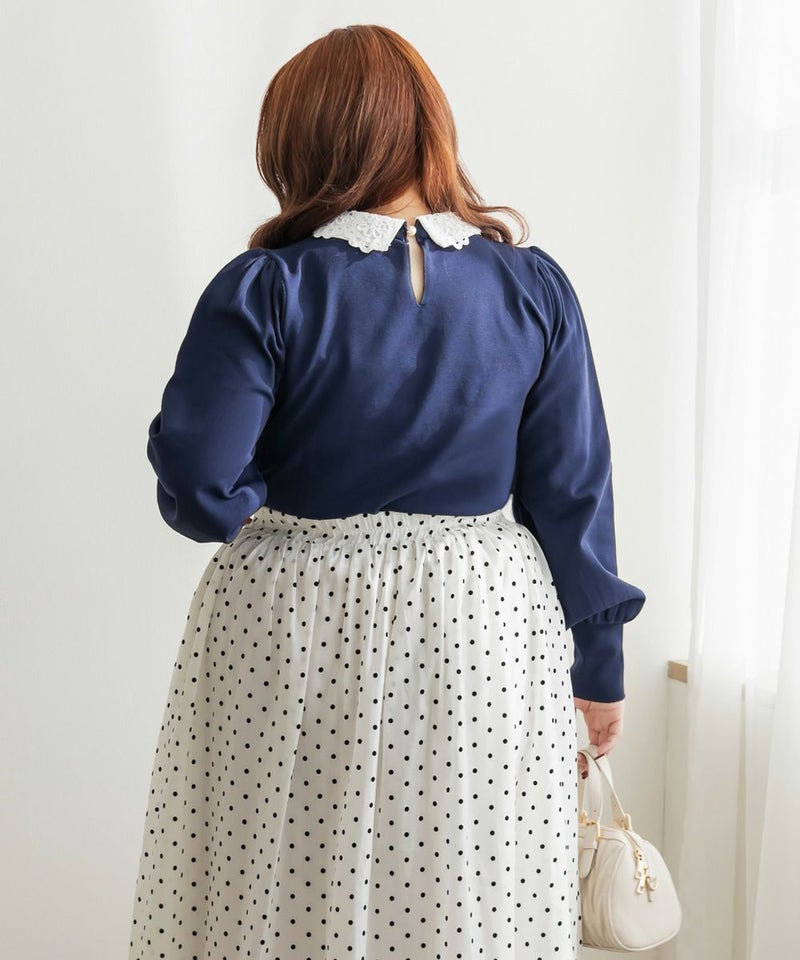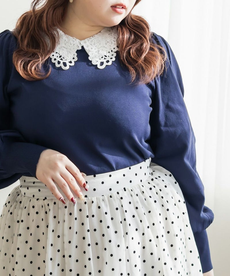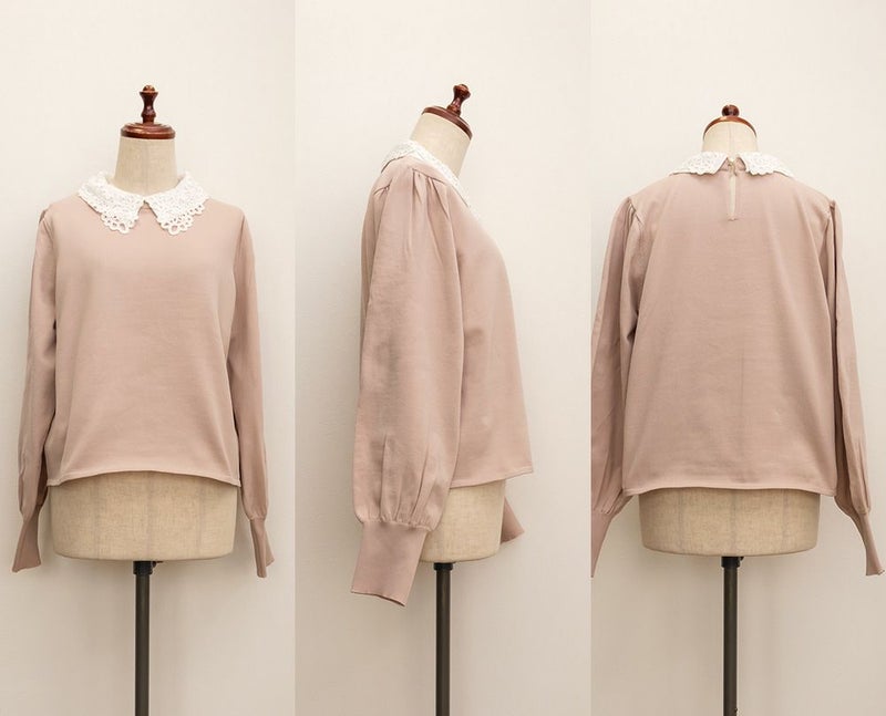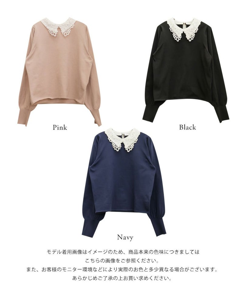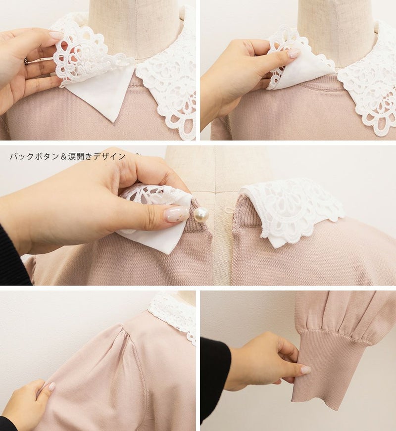 布帛とレースの襟を重ねた上品なニットプルオーバー。カジュアルな印象にならずに女性らしく着られる綺麗めトップス。後襟には大き目パールを使って、後ろ姿まで抜かりない。手首を引き締める袖デザインで二の腕をすっきりとした印象に。