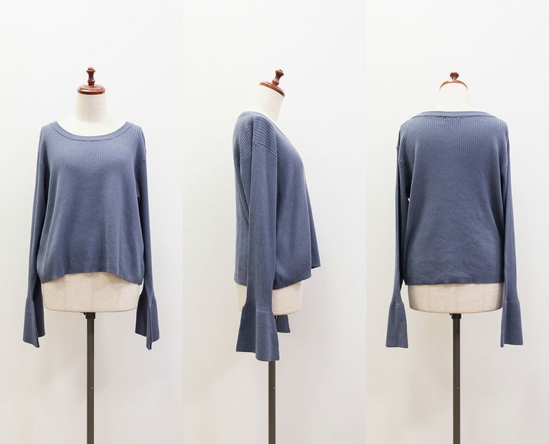 ​写真通りの可愛さです!特に袖のスリットとベルスリーブのデザインが絶妙で、動くたびに手元が綺麗に見えます。リブ素材なので程よく体にフィットして、スタイル良く着こなせます
