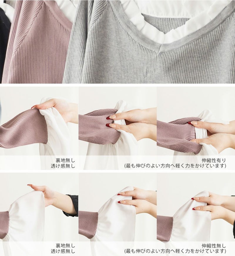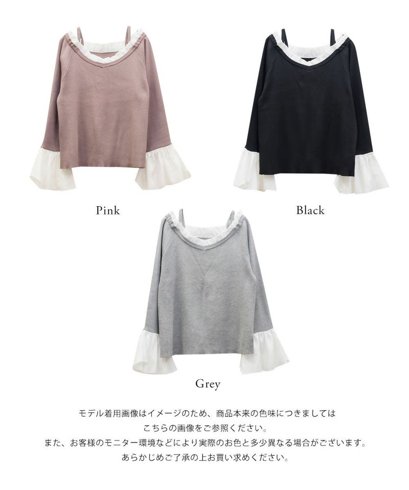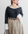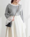 【design】襟元のフリルと袖のフレアがフェミニンなニットプルオーバー。デコルテを綺麗に見せるネックラインと程よくすっきりとしたシルエットで女性らしく着やせできる。袖口のニットと布帛のドッキング部分は伸縮できるから、腕まくりができて実用性があるのもポイント。【material】伸縮性ののあるリブニットに、襟/袖には落ち感のあるジョーゼット素材の布帛がドッキングされています。【styling】女性らしさたっぷりのデザインだから、甘すぎない小物やシューズ合わせがおすすめ。襟とフリルの白色配色でコーデを重くさせない抜け感のある印象に。