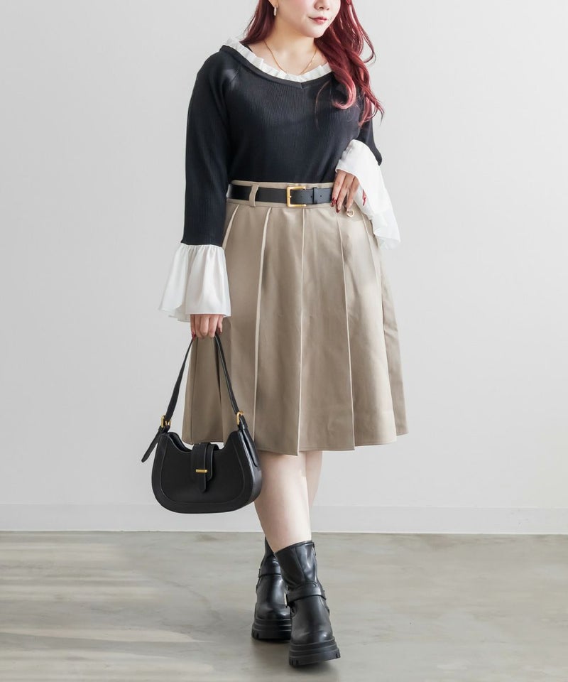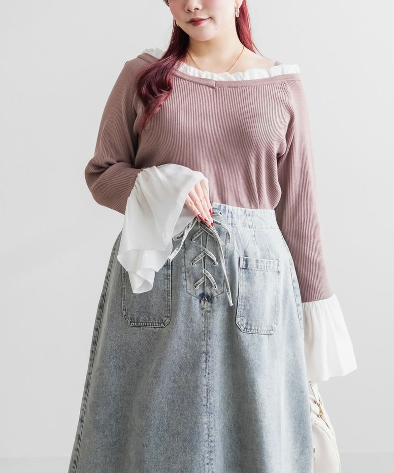 3Lを着て着用感はちょうどよく、ニット部分は伸びるので窮屈感なく楽に着られました。ジョーゼット生地のフリルをドッキングしたデザインが自然に視線を上に集めてくれて、顔回りを華やかに見せてくれます◎ 異素材切り替えでも甘くなりすぎず、大人っぽさが残るバランス感が◎ 1枚でスカート・パンツ合わせでも華やかに見えるのがポイントです♪ きれいめにもカジュアルにも使いやすく、オンオフどちらにも活躍してくれるニットだと思いました。