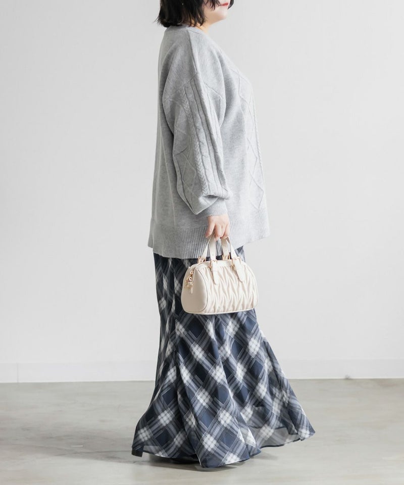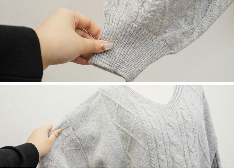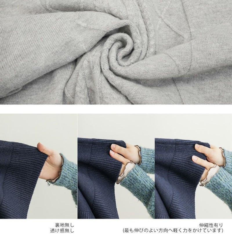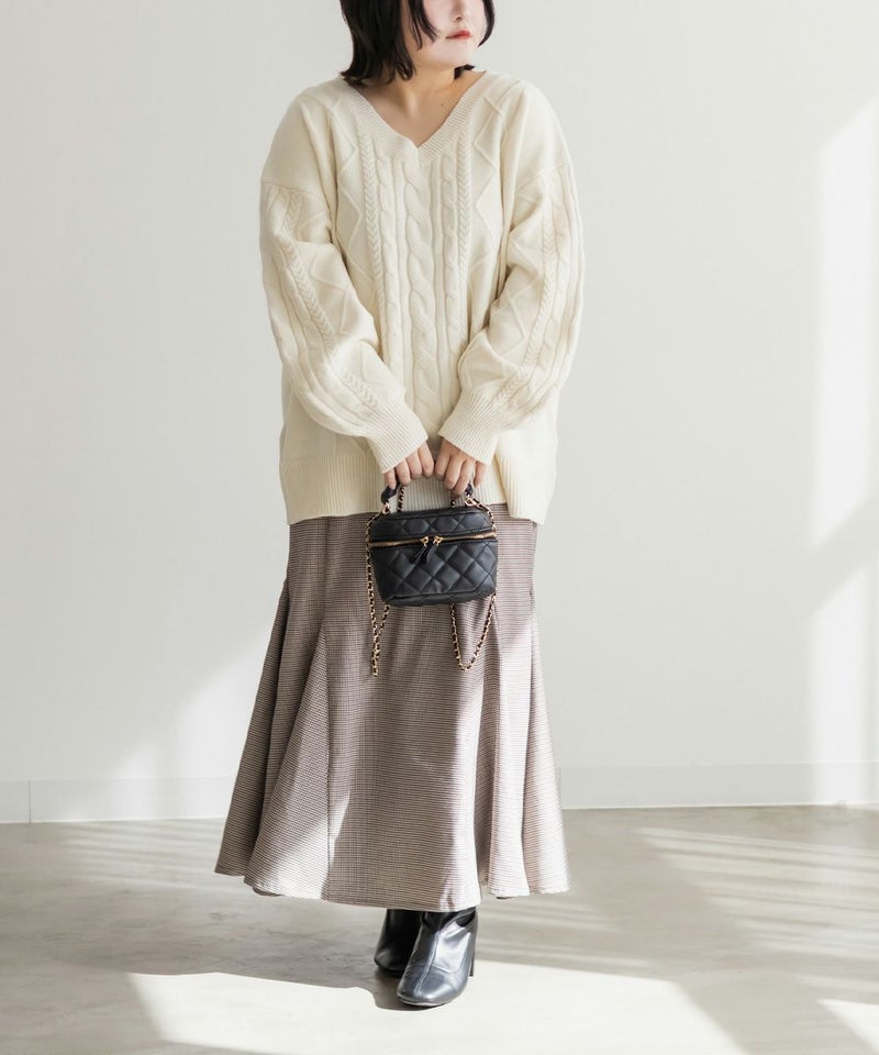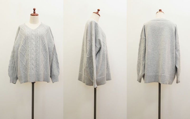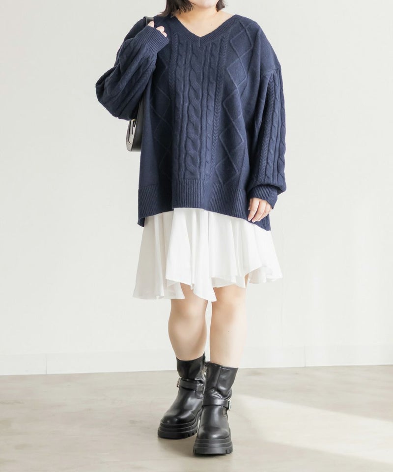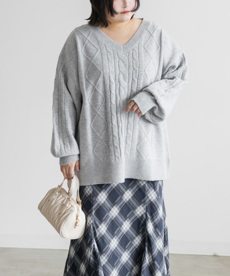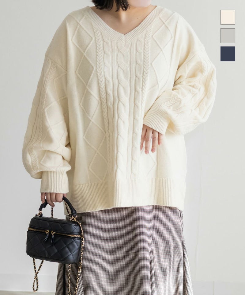 【design】ゆったりとしたサイズ感が可愛いニットプルオーバー。オーバーサイズでボディラインを隠すだけではなく、大き目のケーブル編みで視覚的に身体を小さく見せて、Vネックは小顔効果をプラス、余裕のある袖デザインは二の腕を細く見せてくれます。ヒップラインまで隠れる安心感のある着丈です。【material】柔らかな手触りのニット素材。コートやジャケットを着られるように、分厚すぎないようボリュームを抑えた実用性のある厚み感もポイント。(アウターのデザインによりますのでご注意ください)【styling】ゆったりとしたシルエットだからすっきりとしたシルエットのボトムを合わせると綺麗にまとまります。プリーツスカートやマーメイドスカートと合わせれば女性らしく、すっきりとしたデニムと合わせれば爽やかな印象に。カジュアルなイメージのあるケーブル編みニットにはアクセサリーや小物に女性らしいアイテムを合わせると上級者感が出せるのでおすすめです。
