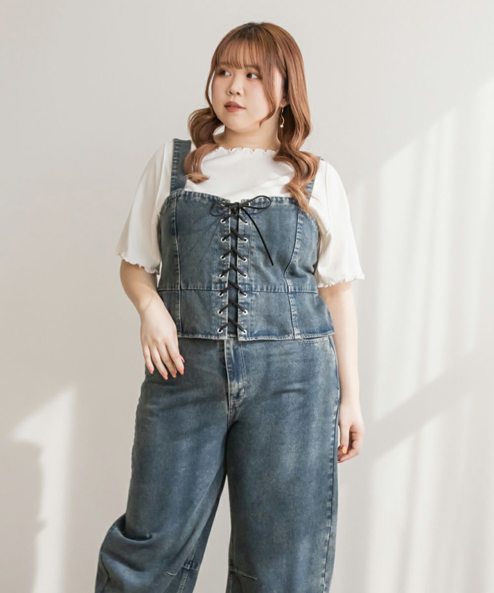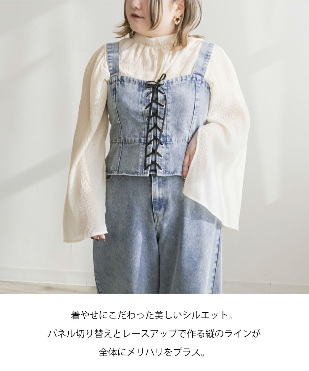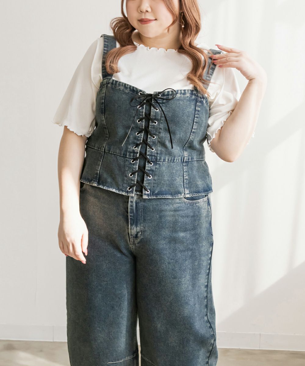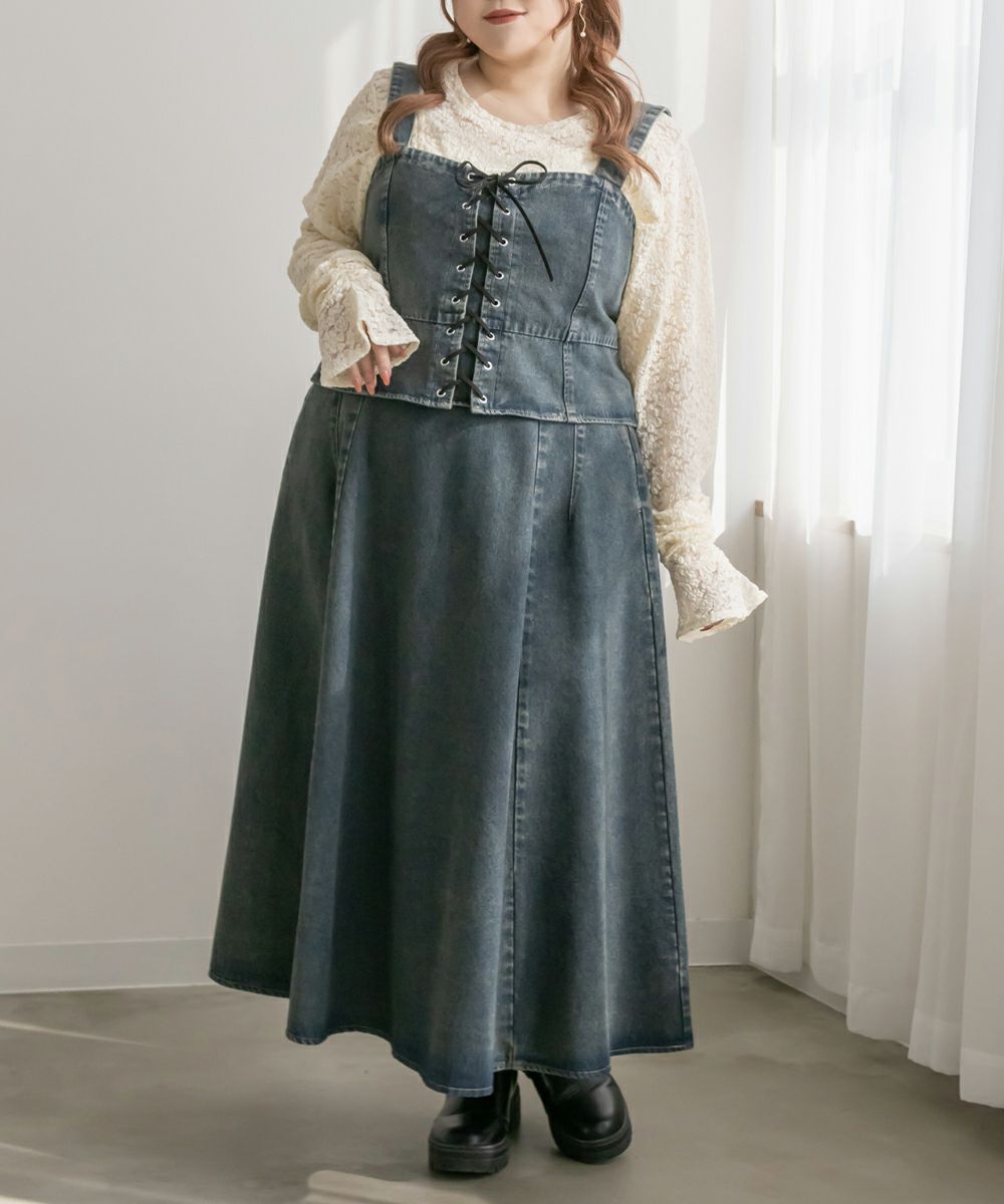 3Lを着てちょうどいいサイズでした!大きいサイズでこういったデザインのデニムビスチェはなかなかないので嬉しい1枚です!ボディラインを拾わないしっかりとしたデニム素材でフロントのレースアップリボンがメリハリがある印象で華奢見えします♪すっきりして見えるよう考えられたデザインなのが嬉しい◎後ゴムになっているからサイズの心配も少なく、楽ちんに来ることができます。心配な方はバストサイズの確認をお勧めします。ぽっこりおなかも気になりづらいペプラムっぽい切替が入っていて、おしゃれだけじゃない考えられた1枚です!オールシーズン着回しできて、ワンピにもスカートにもパンツにも、たくさんファッションを楽しめます!パンツとスカートはセットアップでも着られるので今っぽいスタイリングが楽しめます!