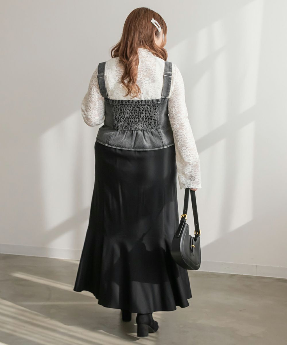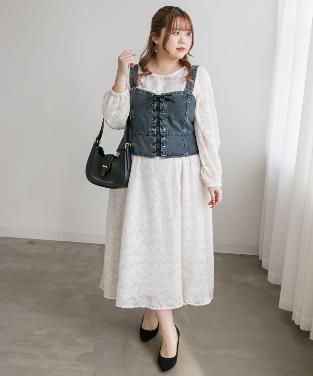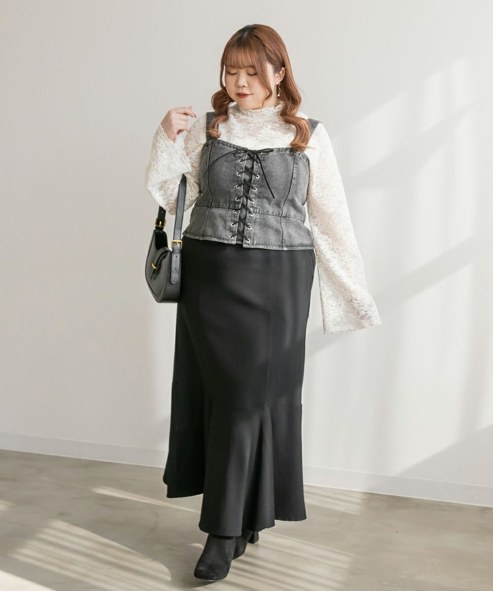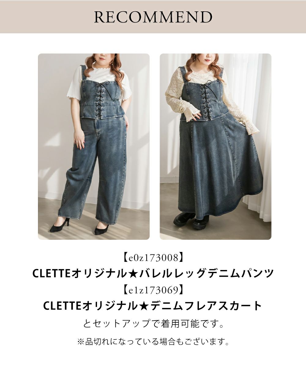 3Lを着てちょうどいいサイズでした!大きいサイズでこういったデザインのデニムビスチェはなかなかないので嬉しい1枚です!ボディラインを拾わないしっかりとしたデニム素材でフロントのレースアップリボンがメリハリがある印象で華奢見えします♪すっきりして見えるよう考えられたデザインなのが嬉しい◎後ゴムになっているからサイズの心配も少なく、楽ちんに来ることができます。心配な方はバストサイズの確認をお勧めします。ぽっこりおなかも気になりづらいペプラムっぽい切替が入っていて、おしゃれだけじゃない考えられた1枚です!オールシーズン着回しできて、ワンピにもスカートにもパンツにも、たくさんファッションを楽しめます!パンツとスカートはセットアップでも着られるので今っぽいスタイリングが楽しめます!