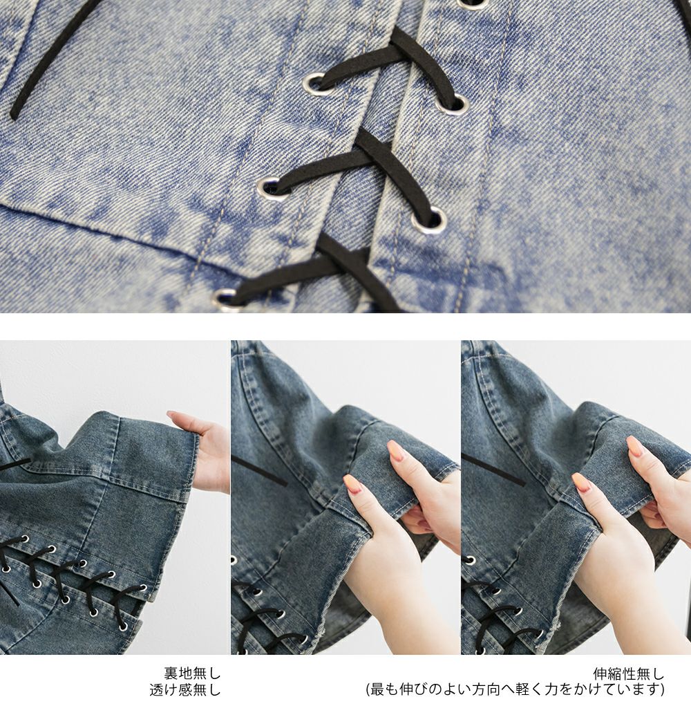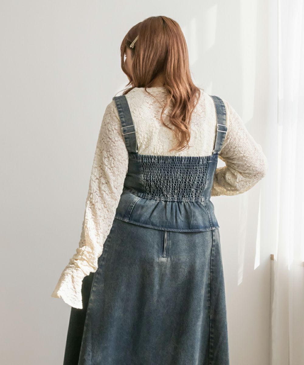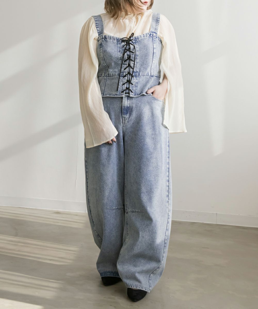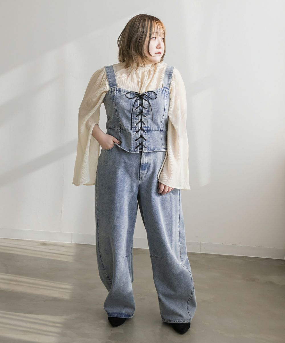3Lを着てちょうどいいサイズでした!大きいサイズでこういったデザインのデニムビスチェはなかなかないので嬉しい1枚です!ボディラインを拾わないしっかりとしたデニム素材でフロントのレースアップリボンがメリハリがある印象で華奢見えします♪すっきりして見えるよう考えられたデザインなのが嬉しい◎後ゴムになっているからサイズの心配も少なく、楽ちんに来ることができます。心配な方はバストサイズの確認をお勧めします。ぽっこりおなかも気になりづらいペプラムっぽい切替が入っていて、おしゃれだけじゃない考えられた1枚です!オールシーズン着回しできて、ワンピにもスカートにもパンツにも、たくさんファッションを楽しめます!パンツとスカートはセットアップでも着られるので今っぽいスタイリングが楽しめます!