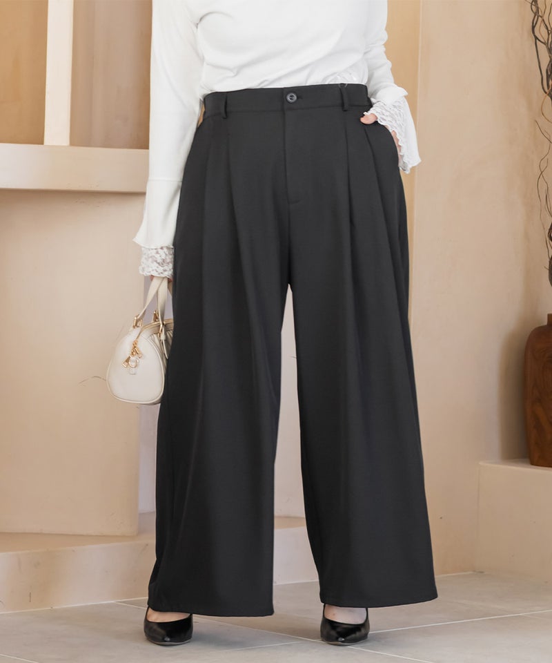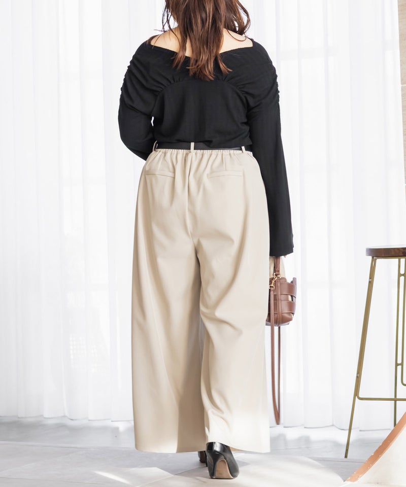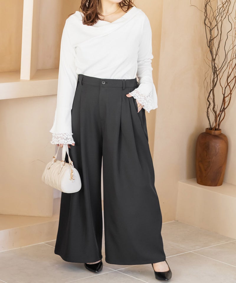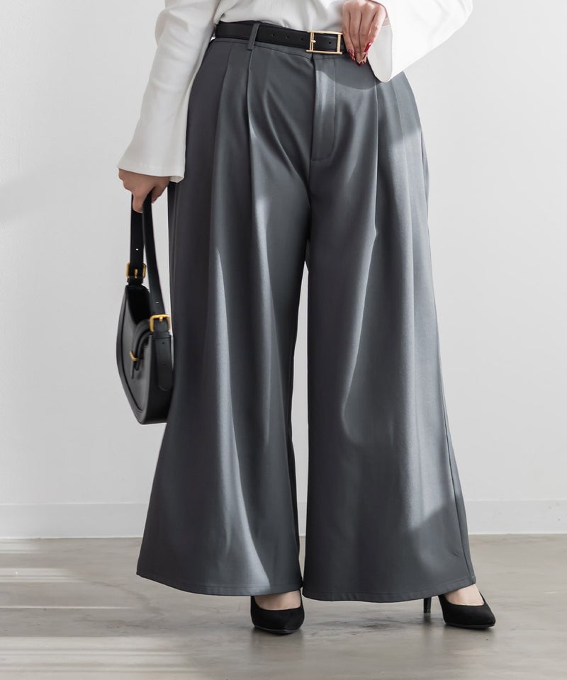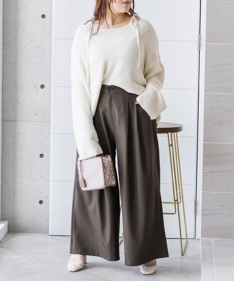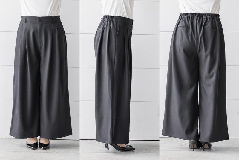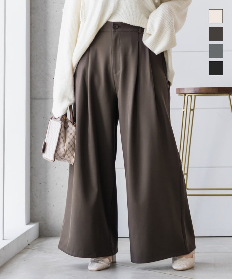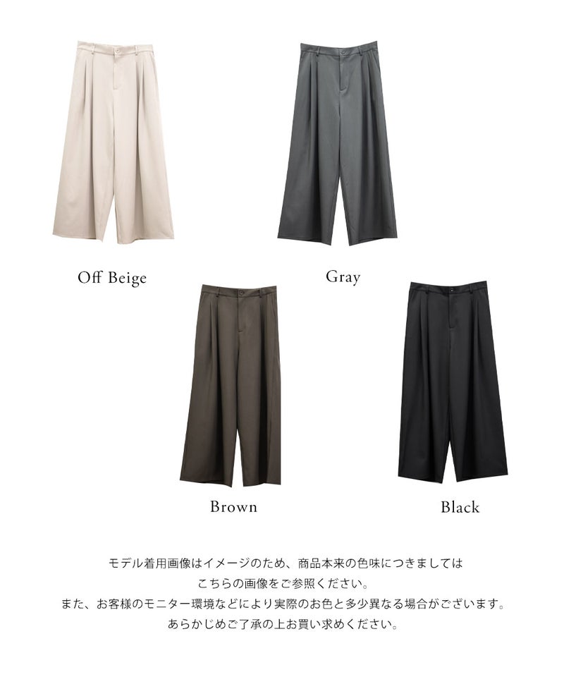 【design】お腹や腰回りをすっきりとさせて、足を長く見せるタックデザインがポイントのワイドパンツ。前にも後にもタックを入れる事で、気になる部分をカバーしつつ縦長効果をプラスしてスタイルアップできるデザイン。【material】シワになりづらい特性の布帛素材。ケアしやすくてオールシーズン使える素材感。程よくしっかりとした生地感だからボディラインも拾いづらい。【styling】普段使いはもちろん、お仕事やちょっとしたフォーマルシーンにも使えます。パンプスともスニーカーとも相性のいい、1枚あればコーディネートの幅が広がるアイテムです。
