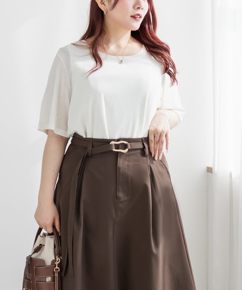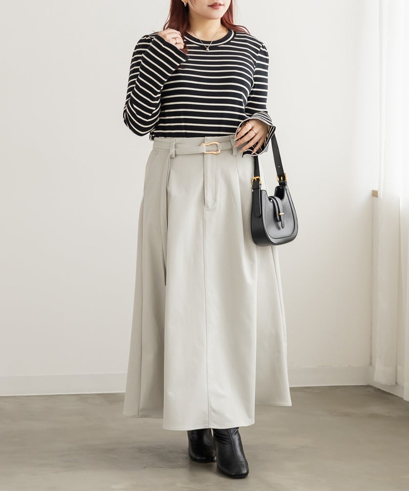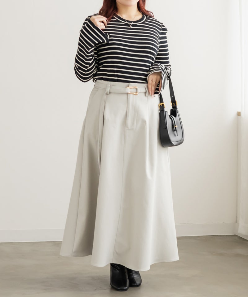3Lサイズを着用しました。ウエストは程よくフィットし、全体的にちょうどいい着心地でした。ニュアンス感のあるバックルベルトがアクセントになり、シンプルながらも洗練された印象に見せてくれます。ウエストマークができるので自然とメリハリが生まれ、スタイルアップ効果も感じられました♪ ロング丈でも重たく見えにくく、すっきりとしたフレアシルエットで着られるのも嬉しいポイント。ブラウス合わせできれいめに、ニットやカットソー合わせで少しカジュアルダウンもできる、着回し力の高いスカートだと思いました◎