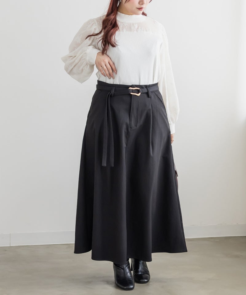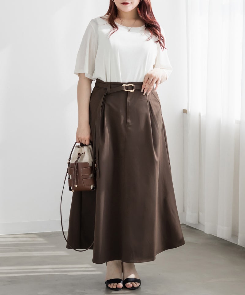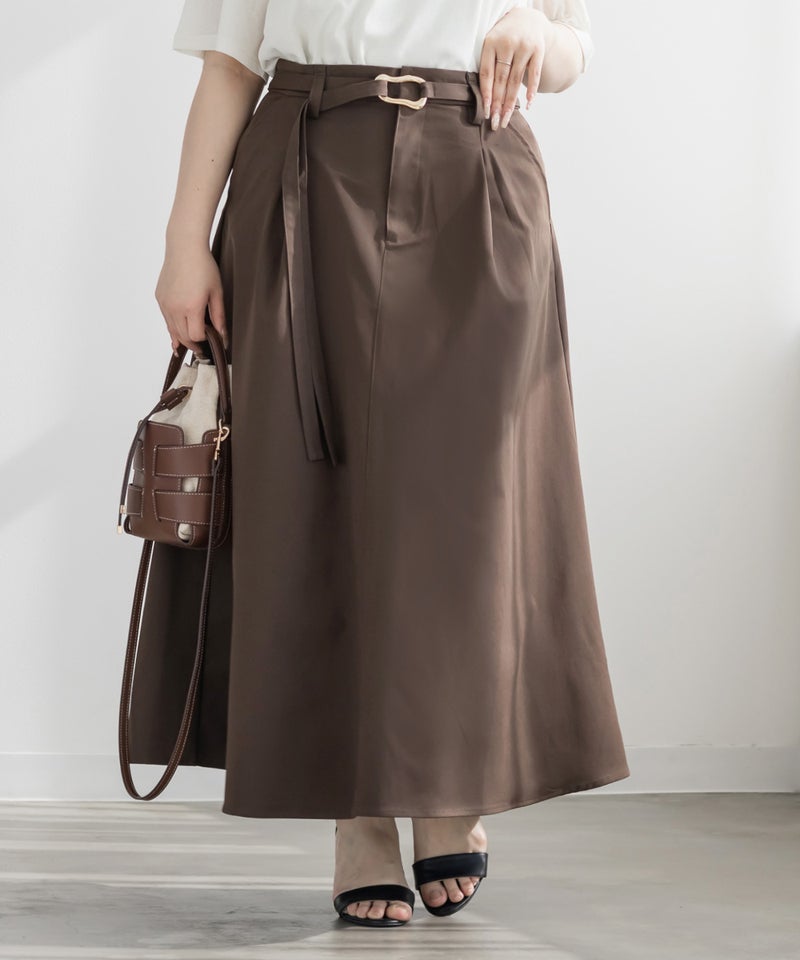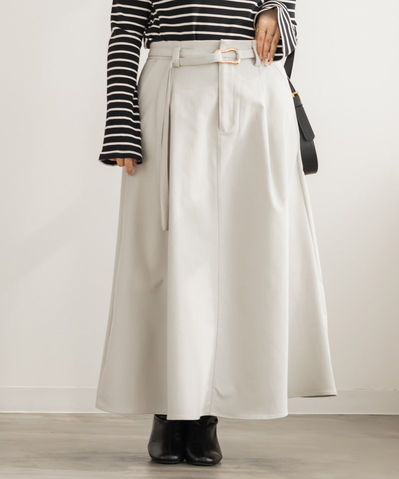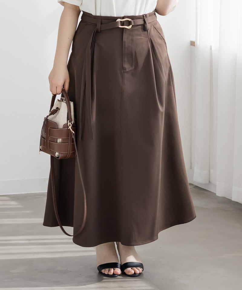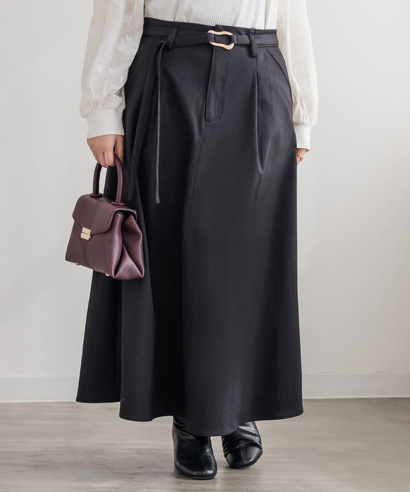 シンプルなセミフレアシルエットにこなれ感のあるバックルがポイントのベルトがセットになったロングスカート。