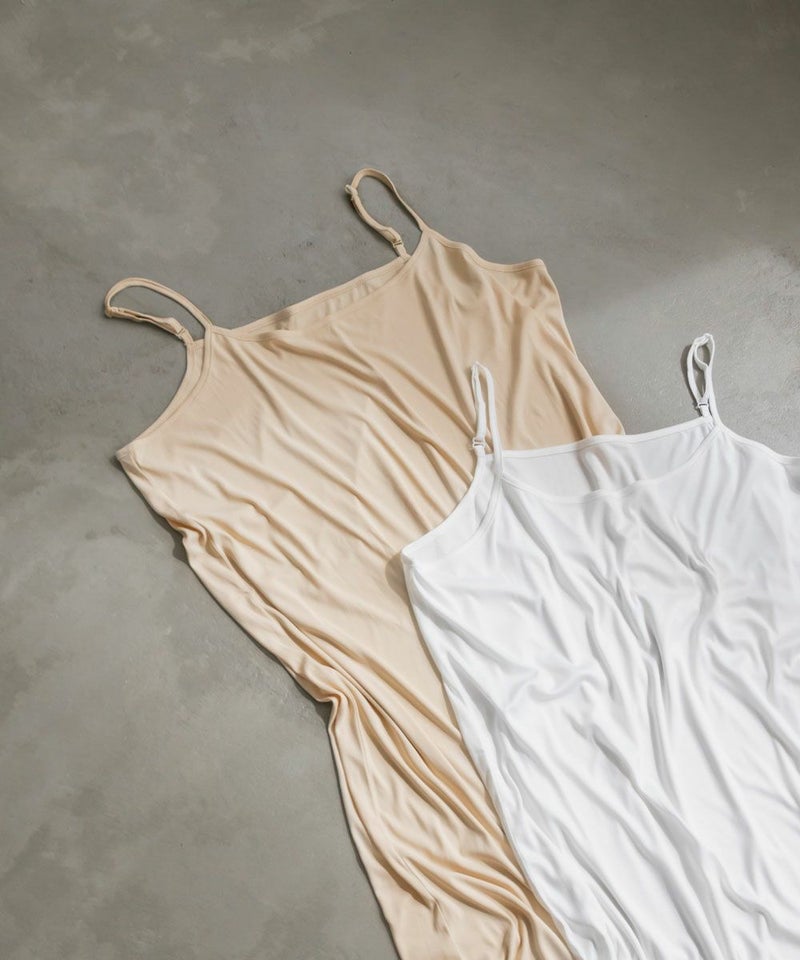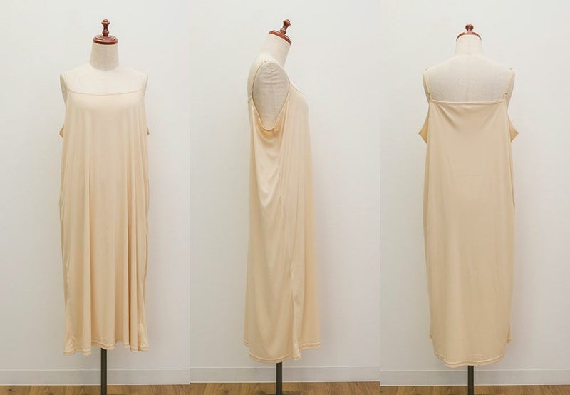 3Lサイズを着てちょうどいいサイズでした。ピタッと身体に密着することが無く、ゆとりのある着心地。さらりとした伸縮性のある生地で、とっても着心地が良いです。胸元がVではなくほぼまっすぐのデザインなので、胸元のあいたワンピースと合わせても安心です◎暑い時期のムレ対策やサテンなど薄手の密着しやすい素材の服の下に着てボディラインカバーにも、オールシーズン色々な用途で着ることができます。