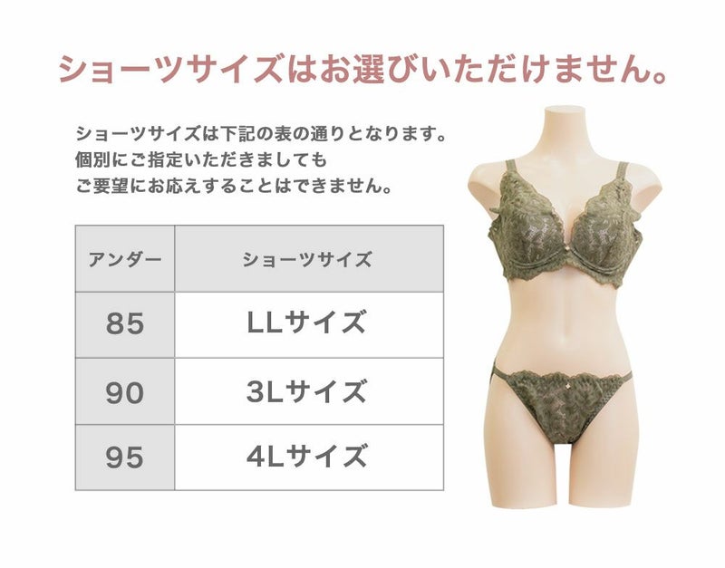 アンダーバスト85→ショーツLLサイズ(ヒップヒップ97-105cm) アンダーバスト90→ショーツ3Lサイズ(ヒップ102-110cm) アンダーバスト95→ショーツ4Lサイズ(ヒップ107-115cm) ※ショーツサイズの交換は出来ません。