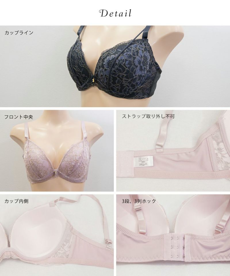 【カップタイプ】3/4カップ・モールドカップ(丸みを形成した厚みのあるカップです)、【ホックの数】3段3列、【パット付属】なし、【パットポケット】なし、【ストラップ取外し】不可、【ワイヤー】あり、※タンブル乾燥禁止