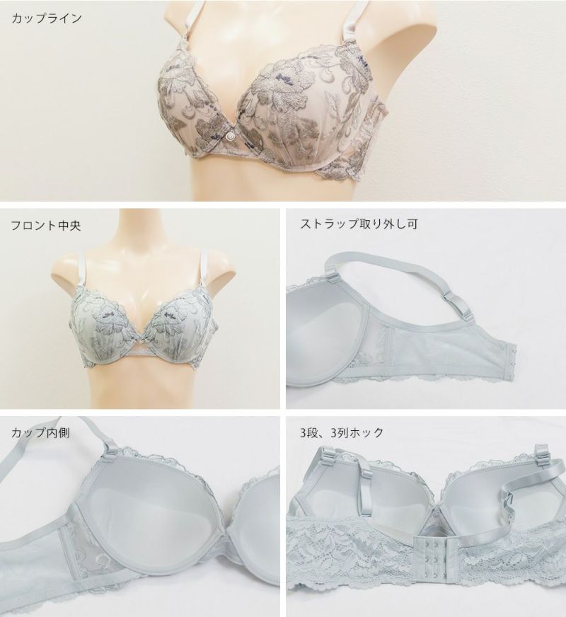 【カップタイプ】3/4カップ・モールドカップ(丸みを形成した厚みのあるカップです)、【ホックの数】3段3列、【パット付属】なし、【パットポケット】なし、【ストラップ取外し】可、【ソフトワイヤー】あり、※タンブル乾燥禁止