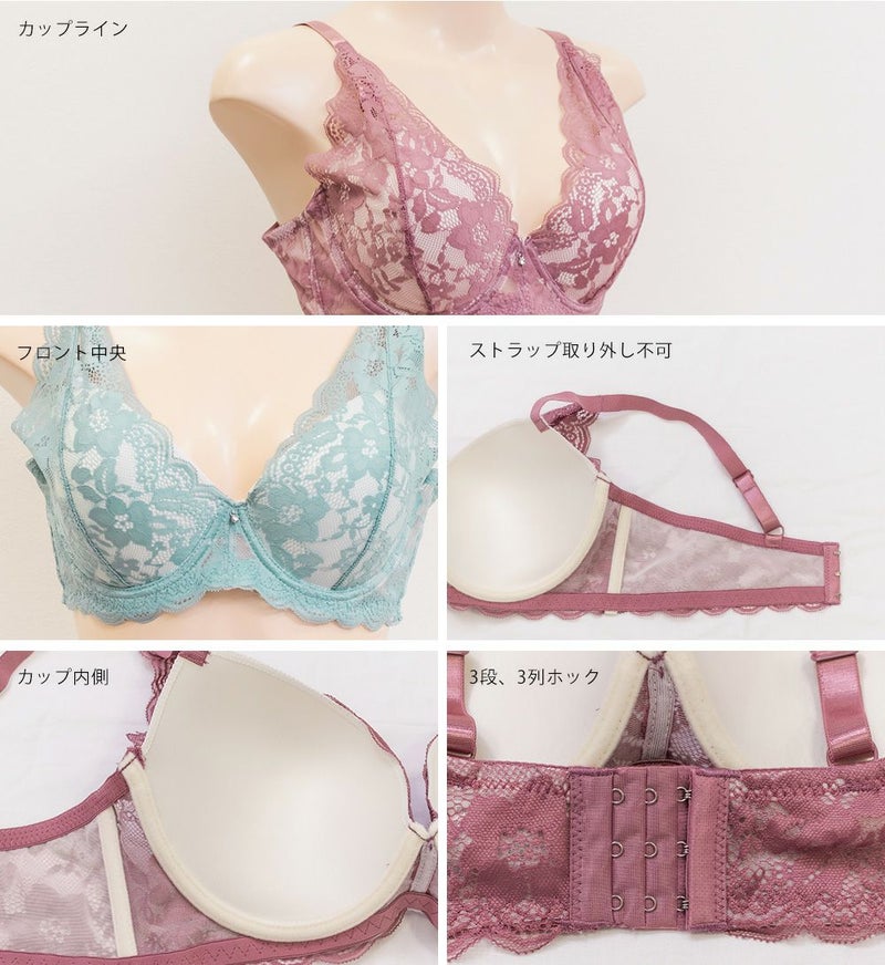 【カップタイプ】3/4カップ・モールドカップ(丸みを形成した厚みのあるカップです)、【ホックの数】3段3列、【パット付属】なし、【パットポケット】なし、【ストラップ取外し】不可、【ワイヤー】あり、※タンブル乾燥禁止