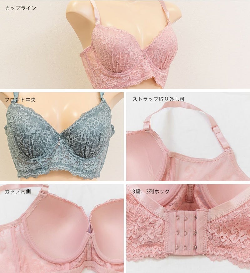 【カップタイプ】3/4カップ・モールドカップ(丸みを形成した厚みのあるカップです)、【ホックの数】3段3列、【パット付属】なし、【パットポケット】なし、【ストラップ取外し】可、【ワイヤー】あり、※タンブル乾燥禁止