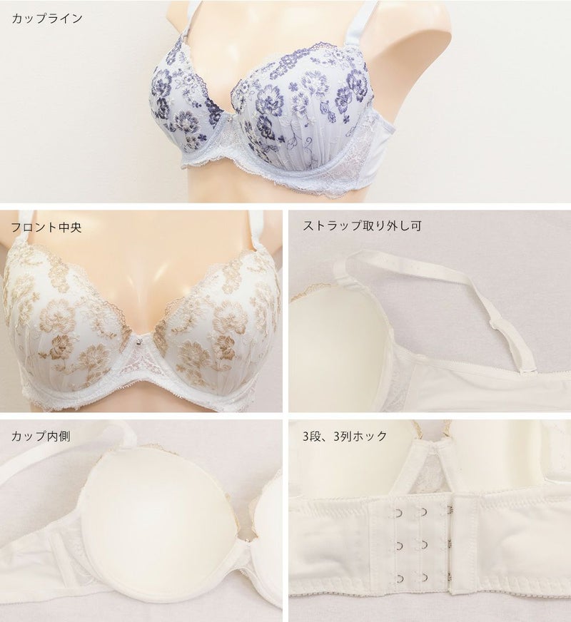 【カップタイプ】3/4カップ・モールドカップ(丸みを形成した厚みのあるカップです)、【ホックの数】3段3列、【パット付属】なし、【パットポケット】なし、【ストラップ取外し】可、【ワイヤー】あり、※タンブル乾燥禁止