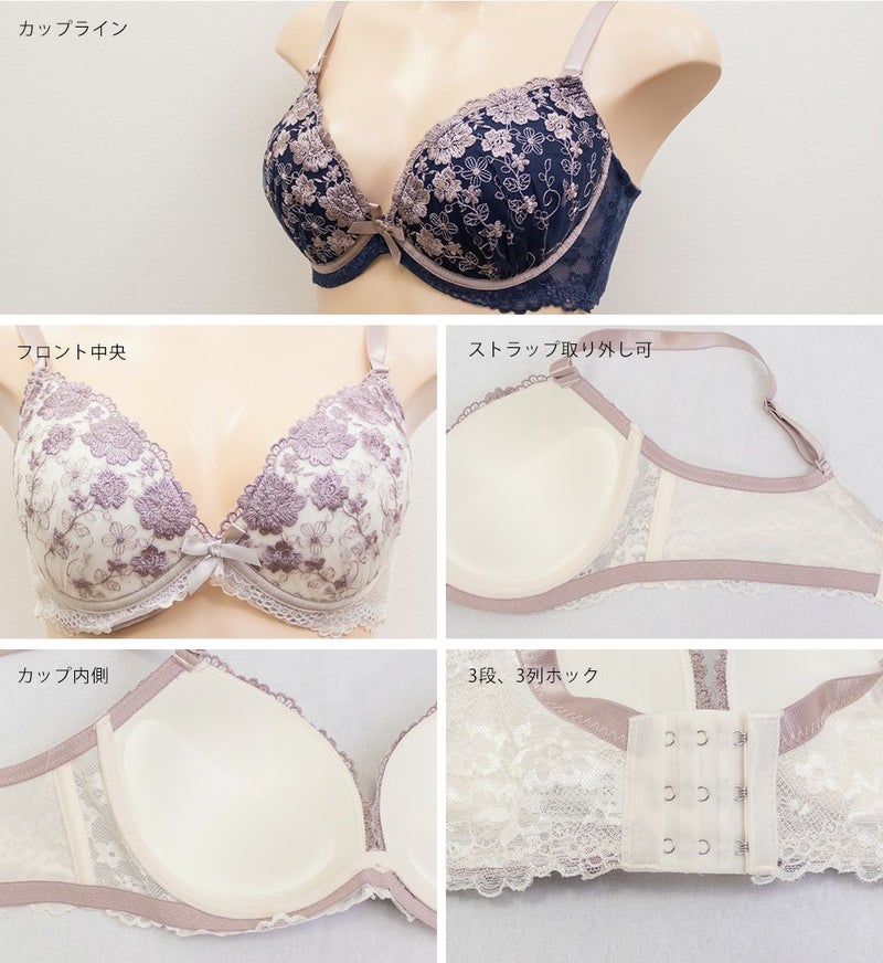 【カップタイプ】3/4カップ・モールドカップ(丸みを形成した厚みのあるカップです)、【ホックの数】3段3列、【パット付属】なし、【パットポケット】なし、【ストラップ取外し】可、【ワイヤー】あり、※タンブル乾燥禁止