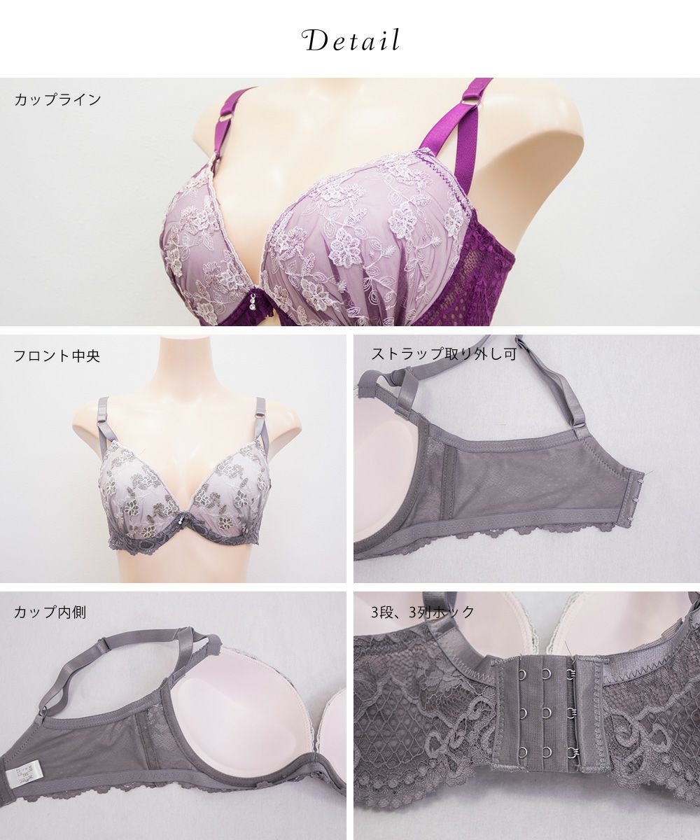 【カップタイプ】3/4カップ・モールドカップ(丸みを形成した厚みのあるカップです)、【ホックの数】3段3列、【パット付属】なし、【パットポケット】なし、【ストラップ取外し】不可、【ワイヤー】あり、※タンブル乾燥禁止