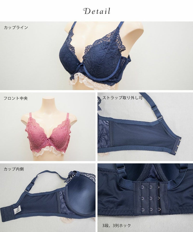 【カップタイプ】3/4カップ・モールドカップ(丸みを形成した厚みのあるカップです)、【ホックの数】三段三列、【パット付属】なし、【パットポケット】なし、【ストラップ取外し】不可、【ワイヤー】あり、※タンブル乾燥禁止 |