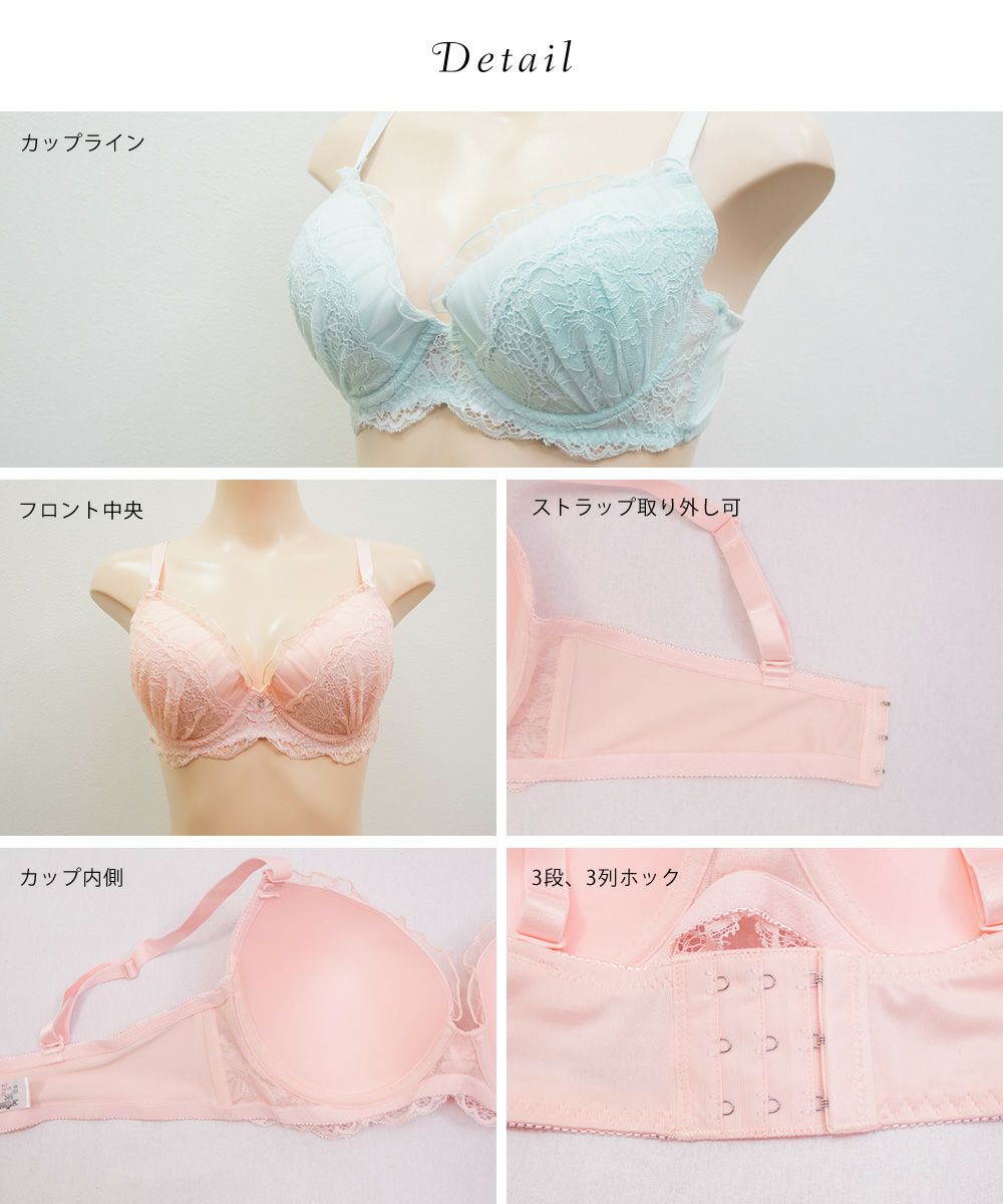 【カップタイプ】3/4カップ・モールドカップ(丸みを形成した厚みのあるカップです)、【ホックの数】三段三列、【パット付属】なし、【パットポケット】なし、【ストラップ取外し】可、【ワイヤー】あり、※タンブル乾燥禁止
