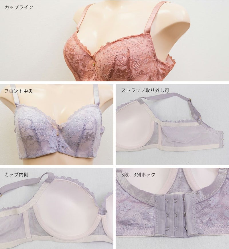 【カップタイプ】3/4カップ・モールドカップ(丸みを形成した厚みのあるカップです)、【ホックの数】3段3列、【パット付属】なし、【パットポケット】なし、【ストラップ取外し】不可、【ワイヤー】あり、※タンブル乾燥禁止