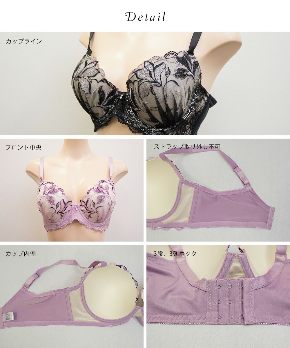 【カップタイプ】3/4カップ・モールドカップ(丸みを形成した厚みのあるカップです)、【ホックの数】3段3列、【パット付属】なし、【パットポケット】なし、【ストラップ取外し】不可、【ワイヤー】あり、※タンブル乾燥禁止 |