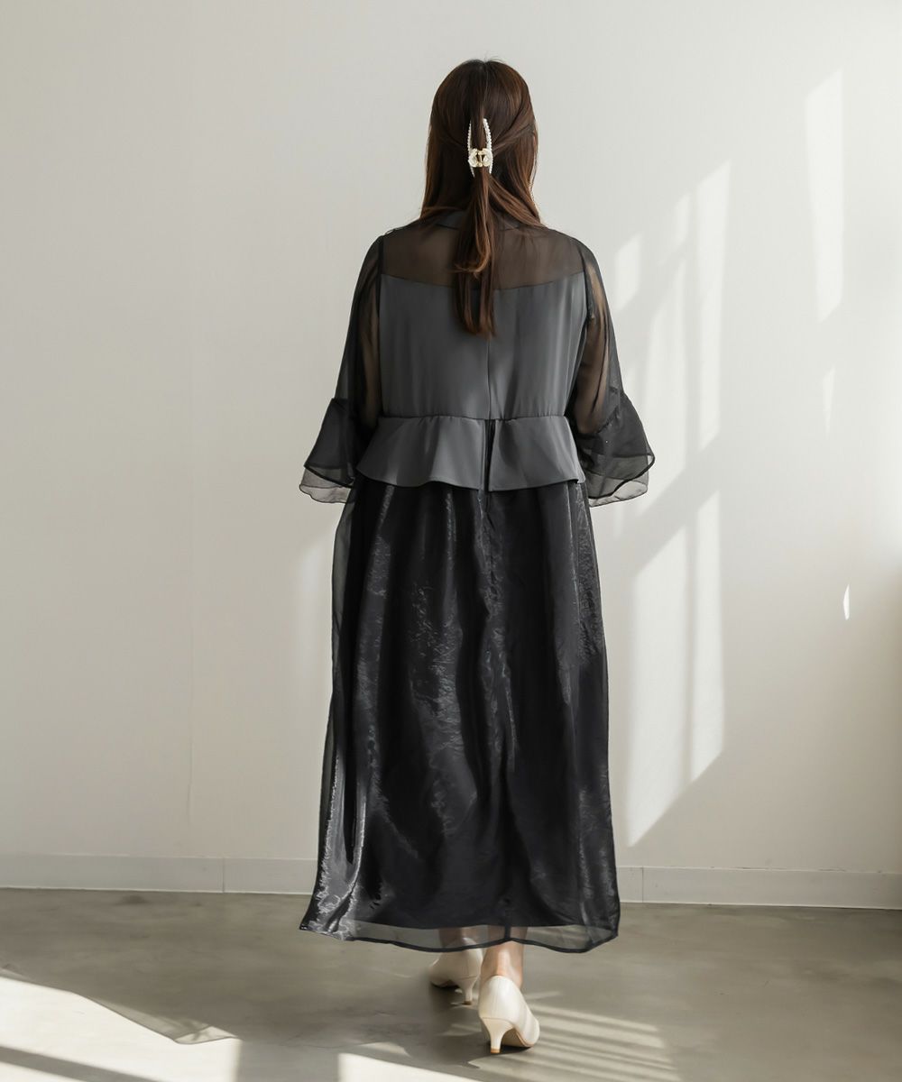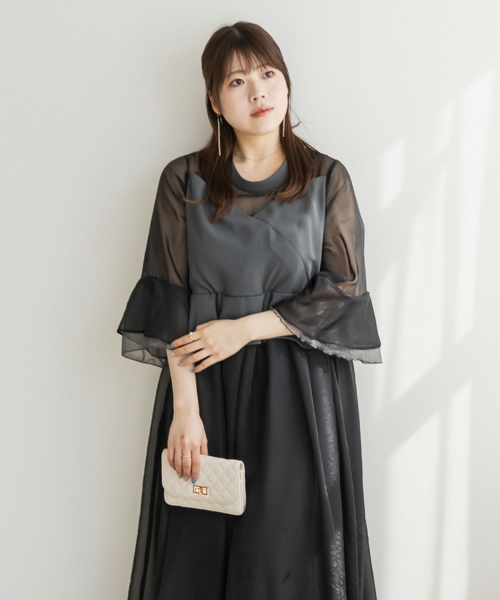 3Lサイズを着用して、ちょうどいいサイズ感でした♪ 軽やかなシフォン素材と程よい光沢感のある生地が上品で、オケージョンシーンにぴったり◎ フレアスリーブが華やかで、腕まわりをふんわりカバーしながら女性らしい印象に。ペプラムデザインがウエストラインを引き締めて見せてくれるので、メリハリのあるシルエットで着こなせました♪ 結婚式やパーティーはもちろん、ジャケットを羽織ればフォーマルなお仕事シーンにも◎ 1枚で華やかに決まる、大人フェミニンなドレスです。