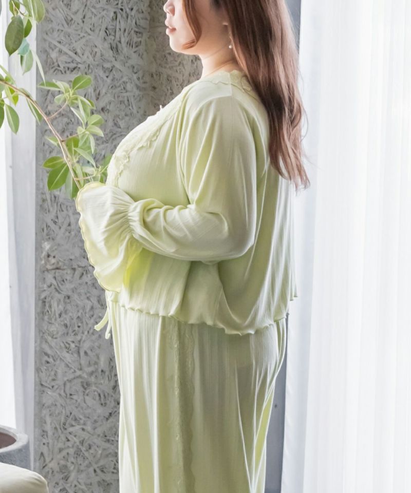3Lサイズを着用してちょうどいい着心地でした。肌触りの良いやわらかいリブ生地でとってもらくちんです!全体的にフィットしすぎない着心地で体のラインも出にくいサイズ感でした◎ストレスフリーな着心地なので快適なおうち時間を過ごせそうです!ショート丈でスタイルアップして見えるのはもちろん、動きやすい丈感なのもポイントです!セットアップできるパンツは長さ違いで揃えたい♪ルームウェアのワンピースに羽織っても可愛いし、普段使いもできるお洒落なデザインなのも嬉しいです!女性らしいルームウェアで可愛く過ごしたい方におすすめです!