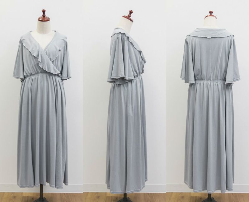3Lサイズを着用して、全体的に程よいゆとりがあり、リラックスした着心地でした! 柔らかくて伸縮性のあるカットソー素材が、肌に馴染んでとても快適♪ ルームウェアとは思えないほどの可愛らしさで、フリルデザインやカシュクール風のシルエットがフェミニンな雰囲気を演出してくれます◎ ウエストゴム仕様で締め付け感がなく、ストレスフリーな着用感が嬉しいポイント! お家時間はもちろん、ワンマイルウェアとしても活躍してくれる万能ワンピースです!