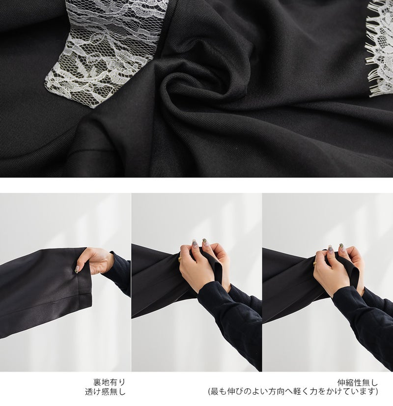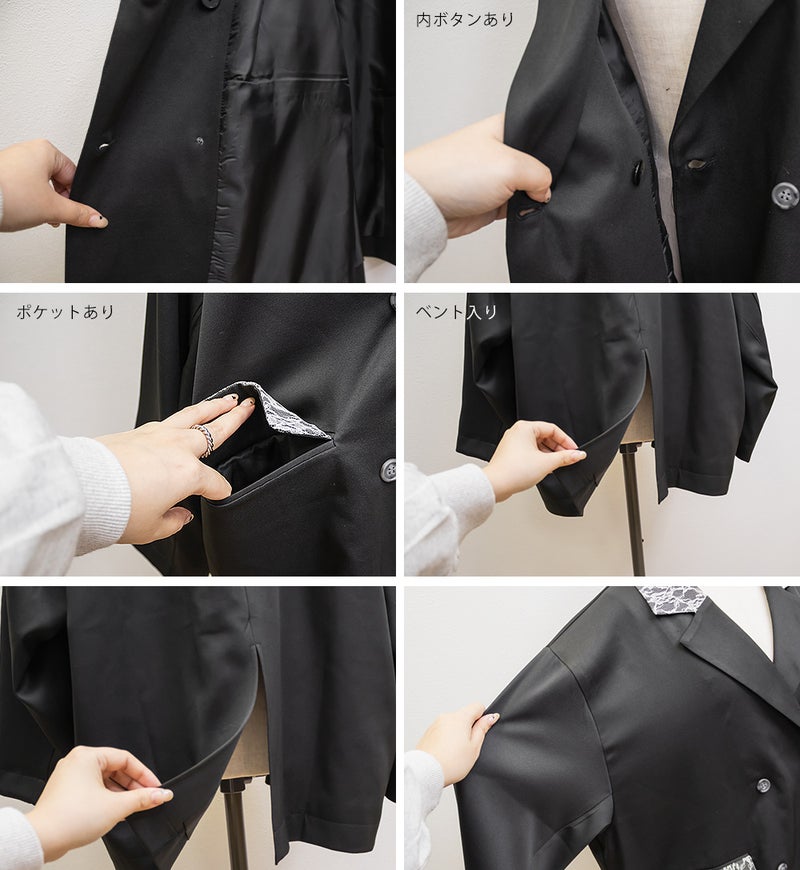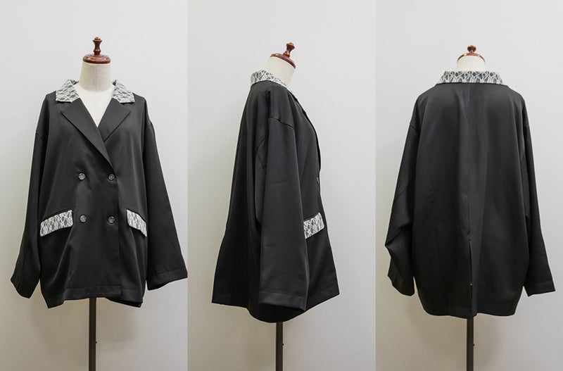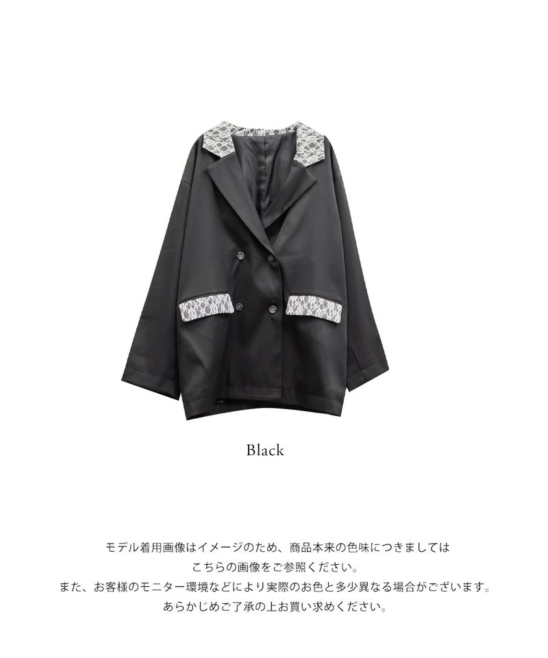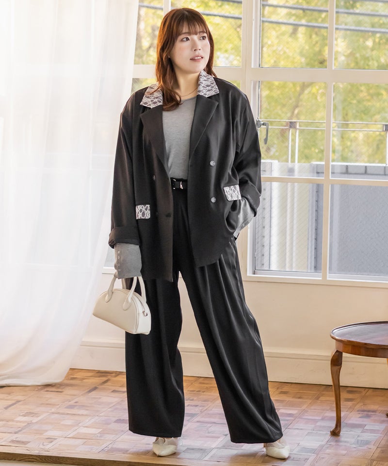 3Lサイズを着用しました。肩まわりや身幅に程よくゆとりがあり、ちょうどいい着心地でした。テーラードデザインできちんと感がありつつ、レース使いがさりげなく女性らしさをプラスしてくれるのが嬉しいポイント♪ ダブル仕様でも重たく見えにくく、すっきりとした印象で着られました。