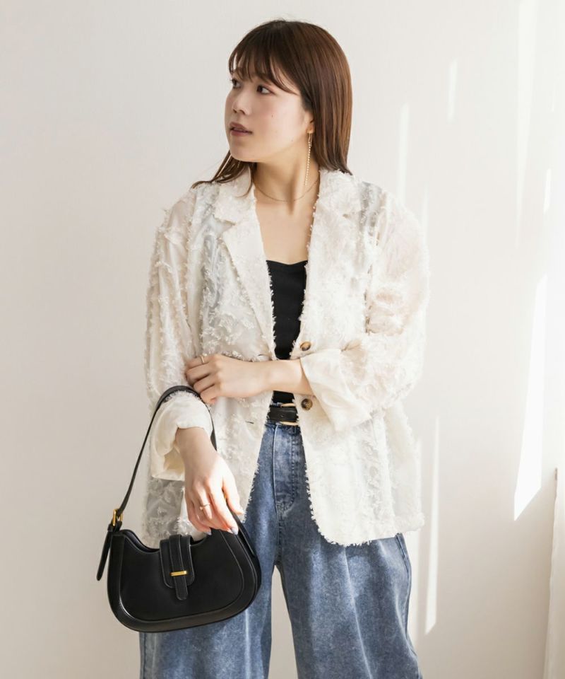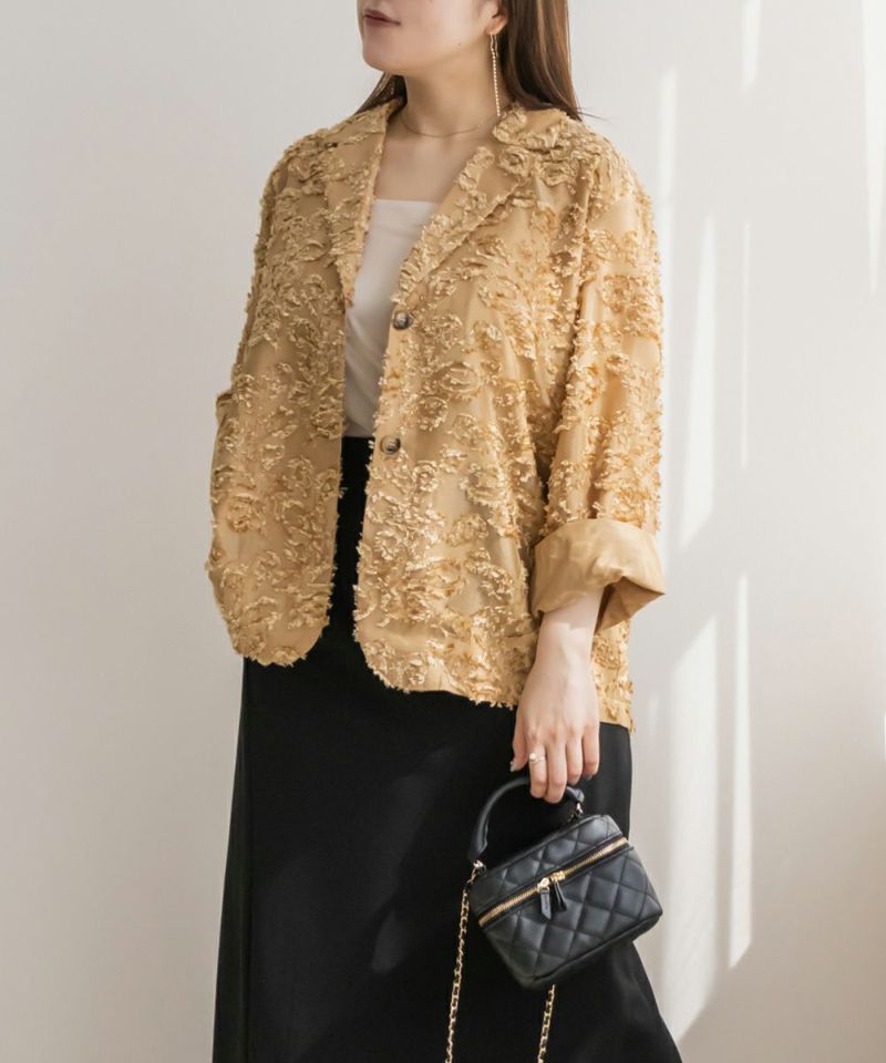 3Lサイズを着用して、程よくゆったりとしたサイズ感でした♪ 全体的に余裕がありつつ、すっきりとしたシルエットでラフに羽織れるのが嬉しいポイント◎ 表面に立体感のある生地が高見えして、大人っぽく華やかな印象に♪ 長めの丈感で気になる腰回りをさりげなくカバーしてくれるのも嬉しいです◎ Tシャツやシンプルなトップスと合わせるだけで、一気にこなれ感のある着こなしに♪ デニムでカジュアルに、スカートやワンピースと合わせて上品にも着こなせる万能ジャケットです。