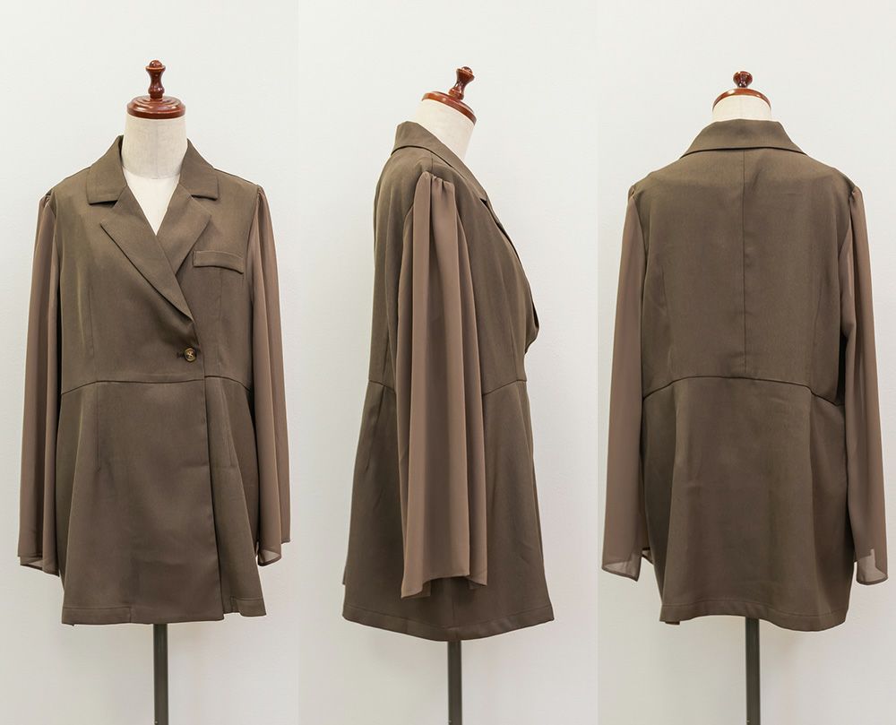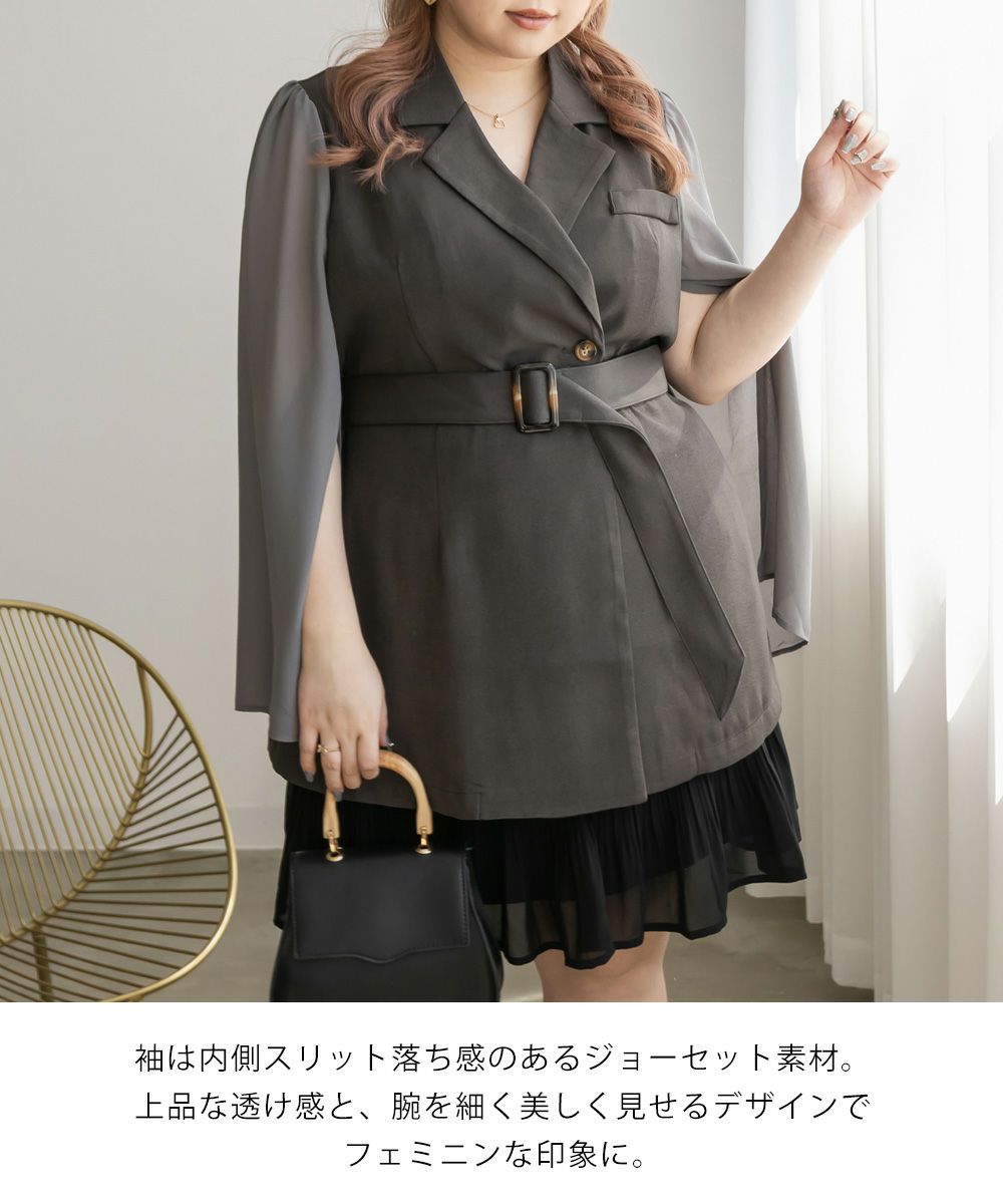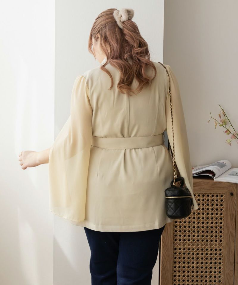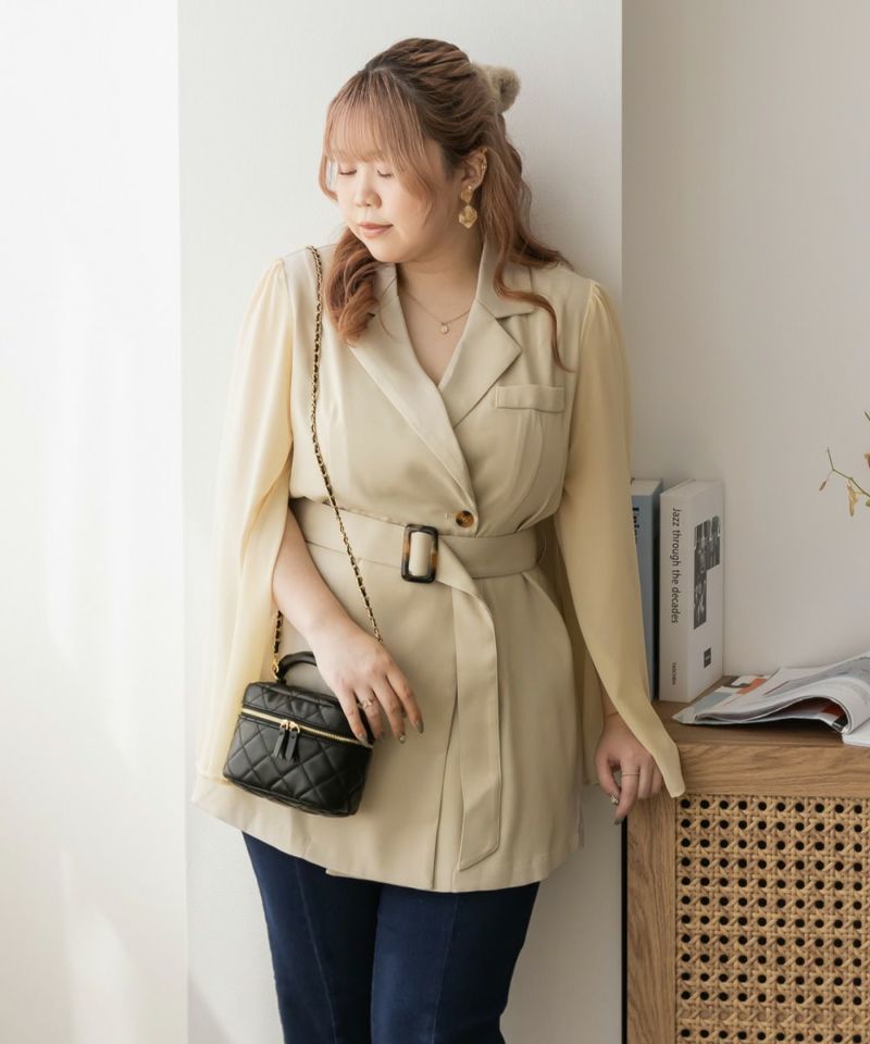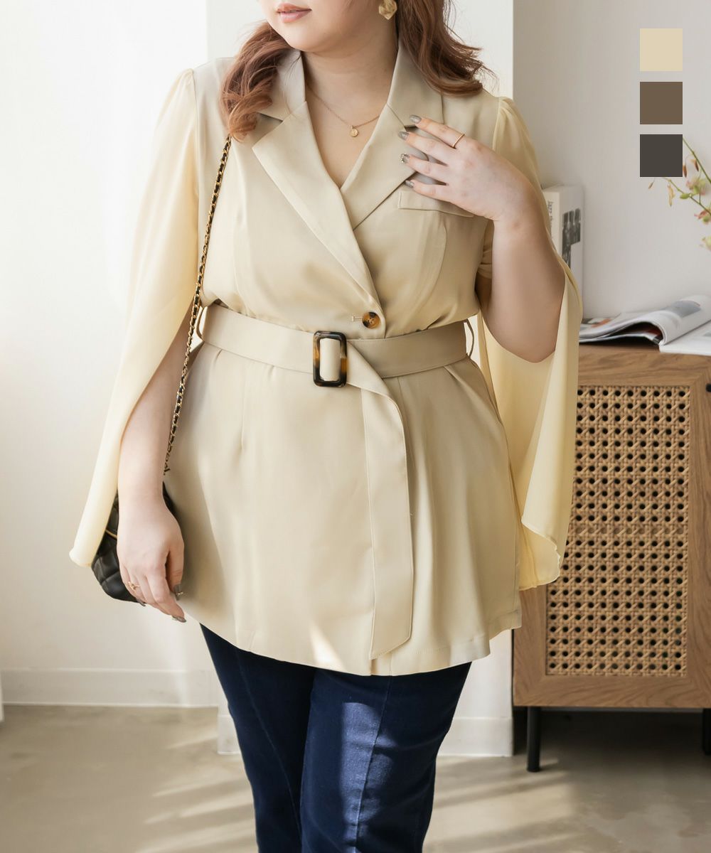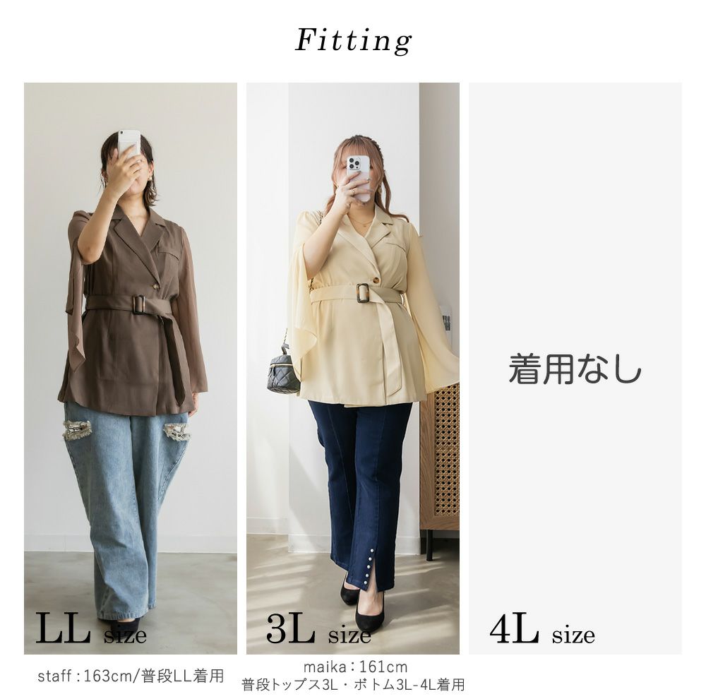 3Lを着てちょうどいいサイズでした。ジャケットでだけどボタンを締めてトップス風に着ることができます。胸ポケットはフェイクですがウエストベルトは自分好みに絞り具合を調節可能◎ウエストを引き締めてヒップラインまで隠してくれる丈なので、メリハリのあるシルエットで着やせできます。内側袖スリットで自然と手元が上品に見えて、二の腕が露出することがないのでとっても細見えできるデザイン♪袖が風通しが良いので、春・夏・初秋までロングシーズン使えるのも嬉しいです!ボトムはミニ丈・ナロースカート・パンツと合わせるとバランスが良いのでおすすめです!
