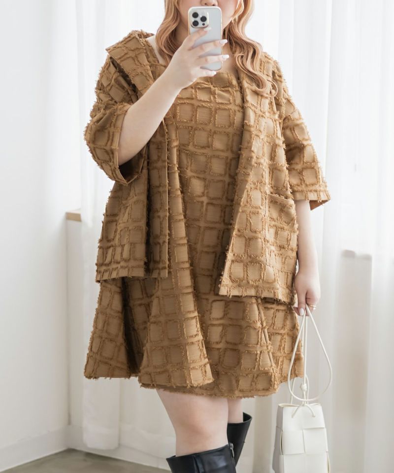 3Lを着用して程よくゆとりがあり、オーバーサイズのシルエットがこなれ感を演出してくれるジャケットでした!さらっと羽織るだけでコーデが一気におしゃれに仕上がるので、シンプルなインナーと合わせるだけでもサマになります。肩まわりや身幅に程よくゆとりがあり、厚手のトップスの上からでも無理なく着られるのが嬉しいポイントです。チェックのジャガード生地が高見えし、カジュアルにもきれいめにも着こなせるのが魅力。全体的にリラックス感がありながらも、シルエットがきれいに決まるので、ちょうどいい着用感でした◎