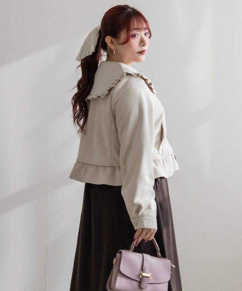 3Lサイズを着用して、ちょうどいいサイズ感でした。アウターなので大きめに着ても可愛いと思うのでLLサイズの方にもおすすめです♪デザインがとにかく可愛くて、秋~春デートにピッタリです!襟と裾はフリル仕様になっていてとにかく可愛いです◎軽いスエード生地で着心地も良く、さっと羽織れるアウターでした。写真映えするアイテムなので、お出かけや旅行にもお勧めです!ジップはリボンになっていてポイントです!