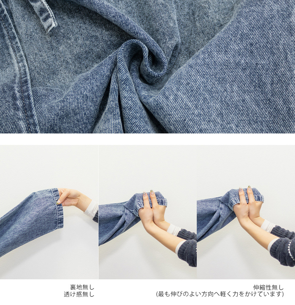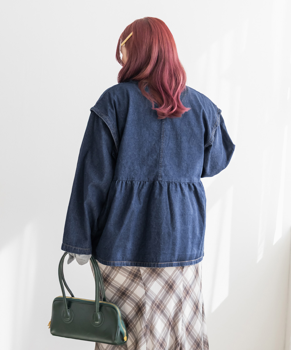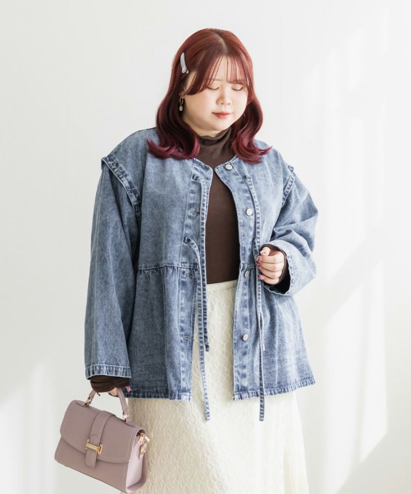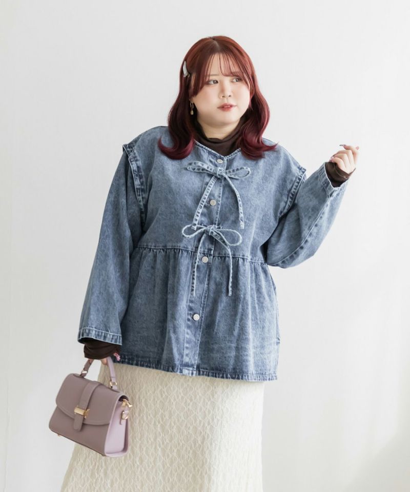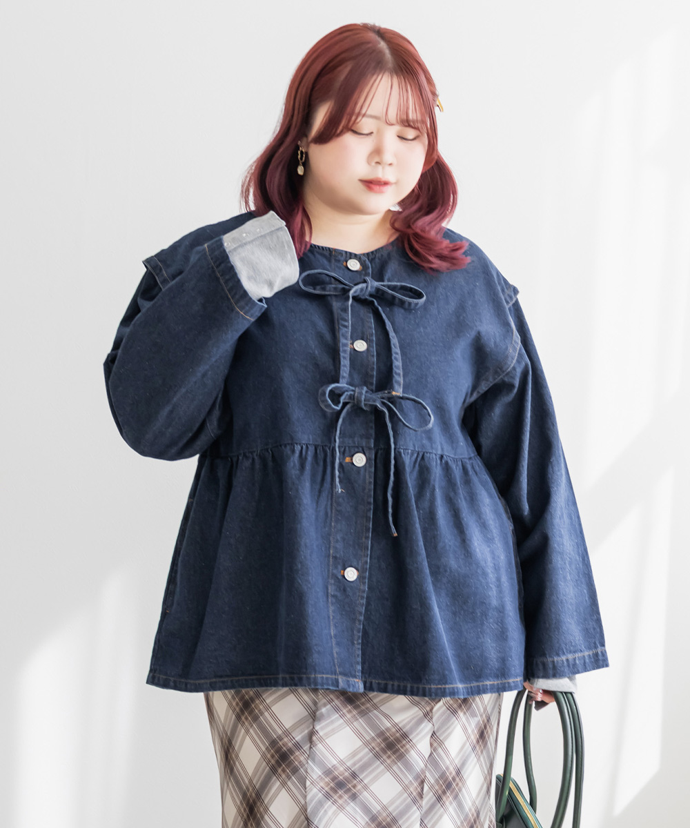 3Lサイズを着用しました。ほどよくゆとりのあるサイズ感で、全体的にちょうどいい着心地です。ハリのあるデニム素材ですがゆとりがあり楽に羽織れました♪ ペプラムシルエットなのでウエストまわりを自然にカバーしてくれて、前を閉じてもバランス良く着られます。丈感も腰回りまでカバーしてくれて、ワンピースやスカート・パンツとも合わせやすい印象でした。カジュアルなデニムジャケットですが、胸元のリボンデザインがさりげなくガーリーな1枚です◎ きれいめボトムと合わせて、大人フェミニンに着こなすのもおすすめです。