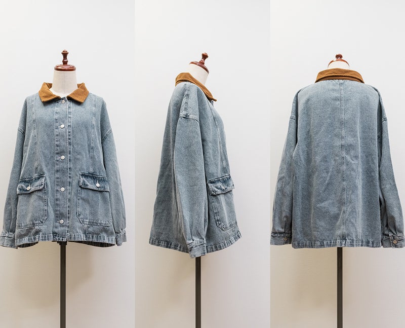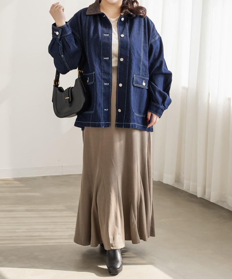 3Lサイズを着用してちょうどいいサイズ感でした。少し長めの丈感でアウターとしてちょうどいいバランスで着られました♪カジュアル感のあるGジャンで、衿がコーデュロイ生地なのが可愛い◎キレイめなスラックスや甘めのスカートと合わせたミックスコーデがおすすめです!定番で持っておきたいアイテムで春秋のアウターとして活躍します!