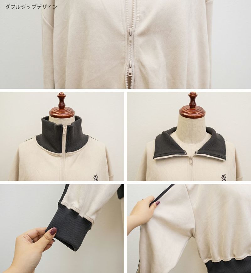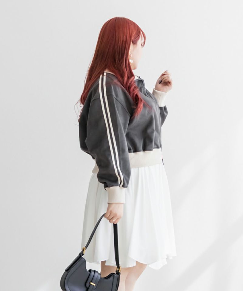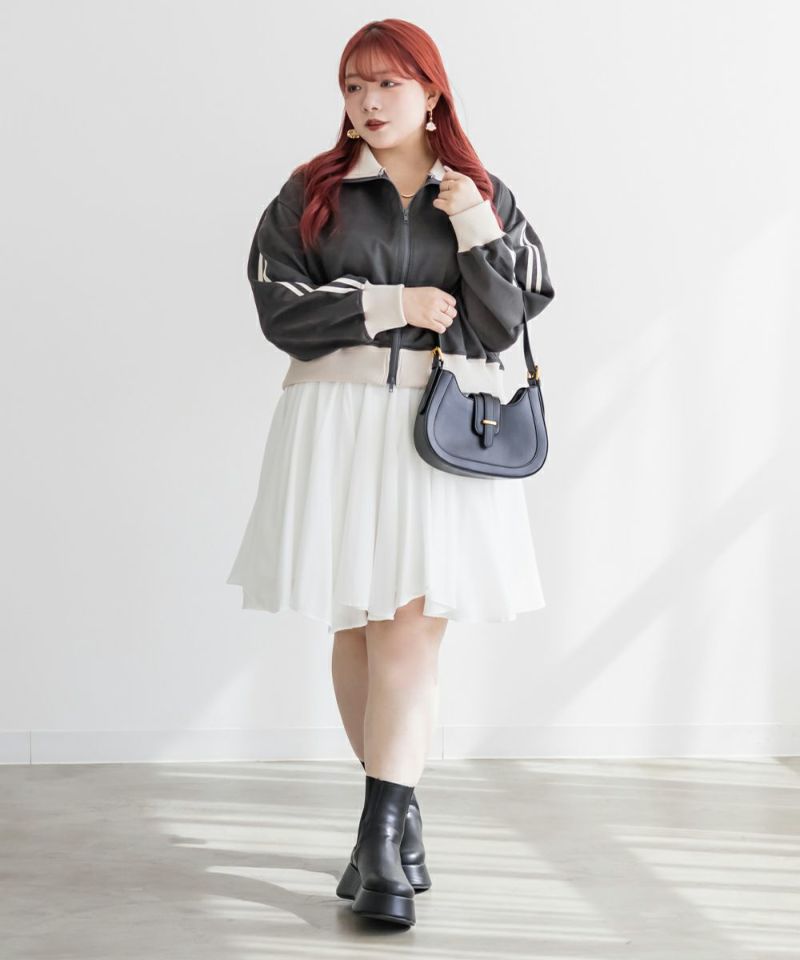 3Lサイズを着用してちょうどいいサイズ感でした◎いつも通りのサイズ選びで問題なさそうです!程よく短丈のジャケットなので、ミニスカートと合わせてもバランスよく着用出来ました。スポーティ要素のあるアイテムとガーリーなアイテムを合わせるのがトレンドで今っぽい雰囲気になれます♪上品なスエード風の生地感が、カジュアル過ぎずにコーデできるのが嬉しいです。トップスとしても羽織としても使えて着回し力が高いのもポイント!
