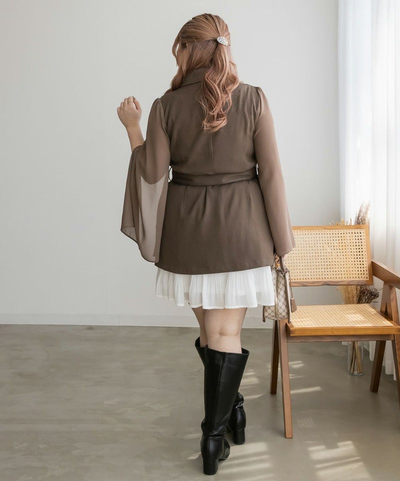 3Lを着てちょうどいいサイズでした。ジャケットでだけどボタンを締めてトップス風に着ることができます。胸ポケットはフェイクですがウエストベルトは自分好みに絞り具合を調節可能◎ウエストを引き締めてヒップラインまで隠してくれる丈なので、メリハリのあるシルエットで着やせできます。内側袖スリットで自然と手元が上品に見えて、二の腕が露出することがないのでとっても細見えできるデザイン♪袖が風通しが良いので、春・夏・初秋までロングシーズン使えるのも嬉しいです!ボトムはミニ丈・ナロースカート・パンツと合わせるとバランスが良いのでおすすめです!