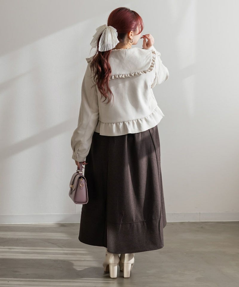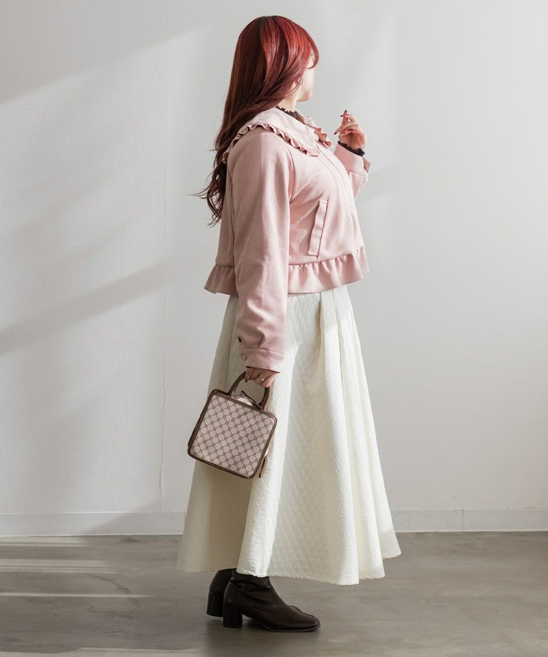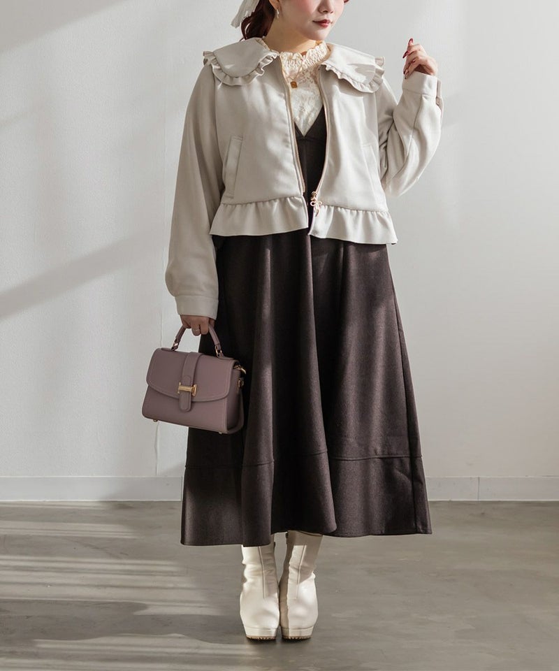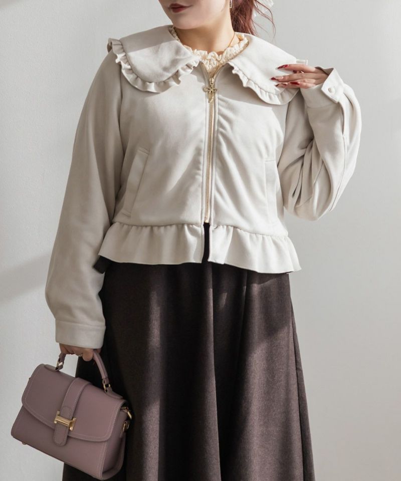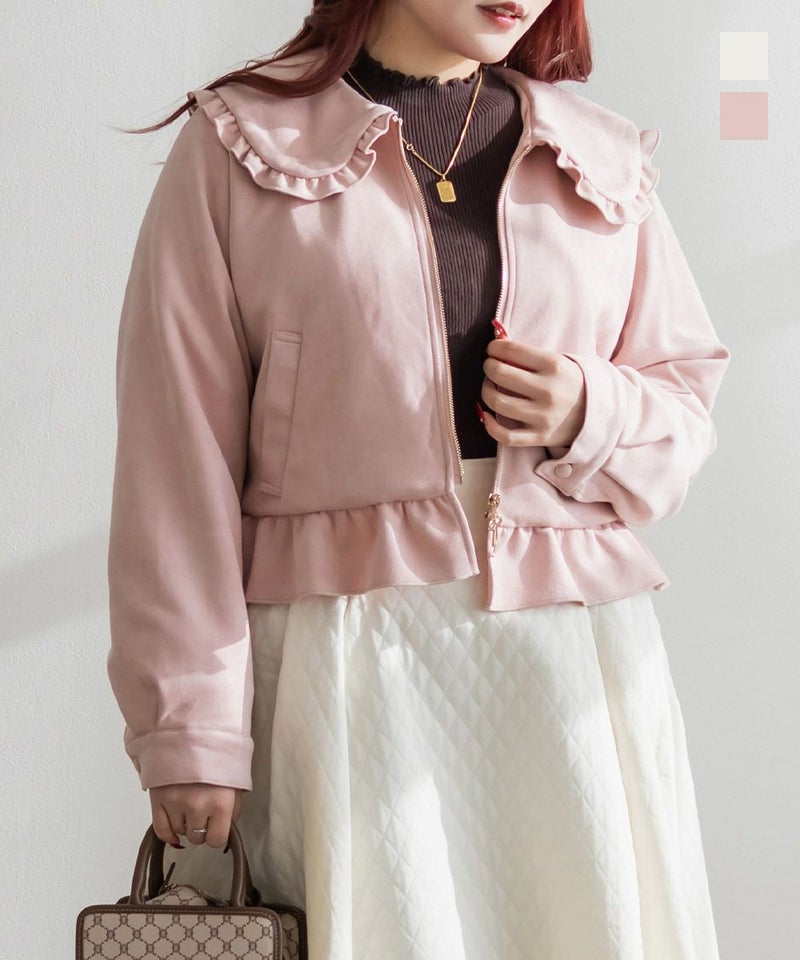 3Lサイズを着用して、ちょうどいいサイズ感でした。アウターなので大きめに着ても可愛いと思うのでLLサイズの方にもおすすめです♪デザインがとにかく可愛くて、秋~春デートにピッタリです!襟と裾はフリル仕様になっていてとにかく可愛いです◎軽いスエード生地で着心地も良く、さっと羽織れるアウターでした。写真映えするアイテムなので、お出かけや旅行にもお勧めです!ジップはリボンになっていてポイントです!