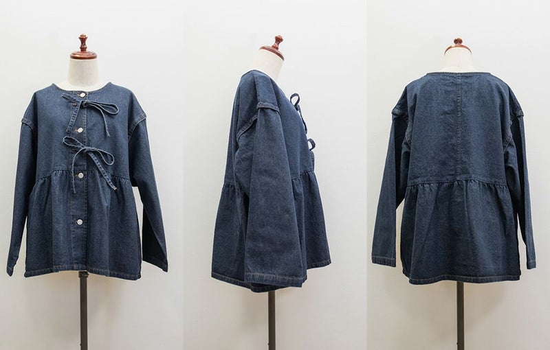 3Lサイズを着用しました。ほどよくゆとりのあるサイズ感で、全体的にちょうどいい着心地です。ハリのあるデニム素材ですがゆとりがあり楽に羽織れました♪ ペプラムシルエットなのでウエストまわりを自然にカバーしてくれて、前を閉じてもバランス良く着られます。丈感も腰回りまでカバーしてくれて、ワンピースやスカート・パンツとも合わせやすい印象でした。カジュアルなデニムジャケットですが、胸元のリボンデザインがさりげなくガーリーな1枚です◎ きれいめボトムと合わせて、大人フェミニンに着こなすのもおすすめです。
