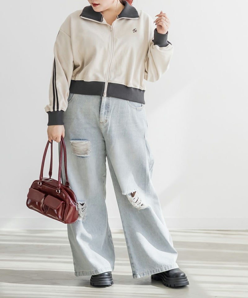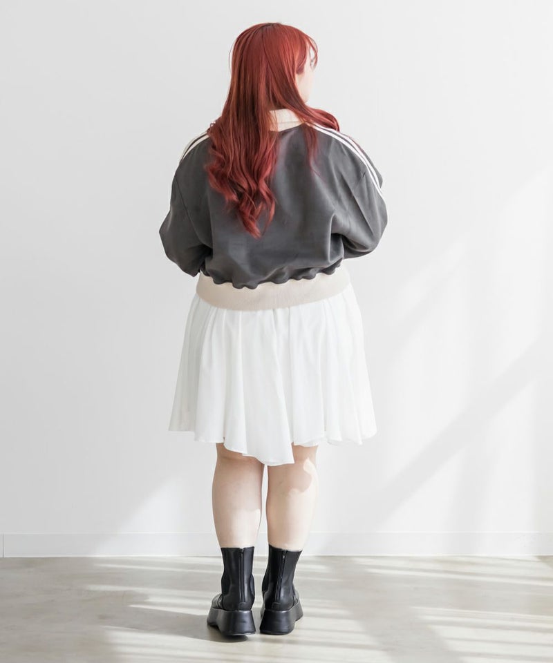 3Lサイズを着用してちょうどいいサイズ感でした◎いつも通りのサイズ選びで問題なさそうです!程よく短丈のジャケットなので、ミニスカートと合わせてもバランスよく着用出来ました。スポーティ要素のあるアイテムとガーリーなアイテムを合わせるのがトレンドで今っぽい雰囲気になれます♪上品なスエード風の生地感が、カジュアル過ぎずにコーデできるのが嬉しいです。トップスとしても羽織としても使えて着回し力が高いのもポイント!