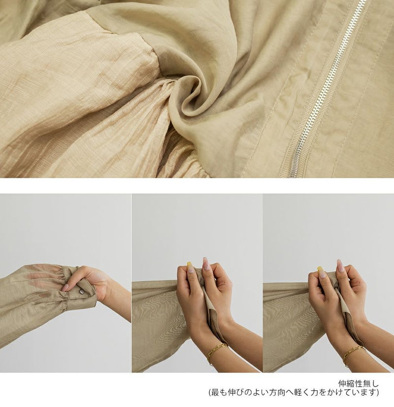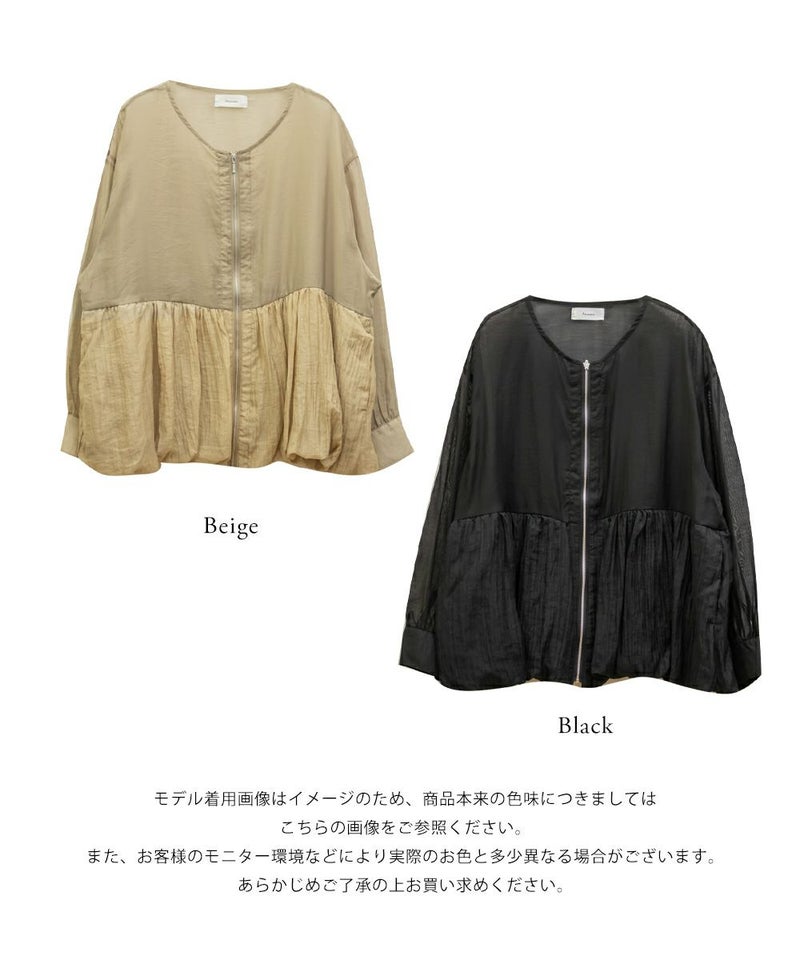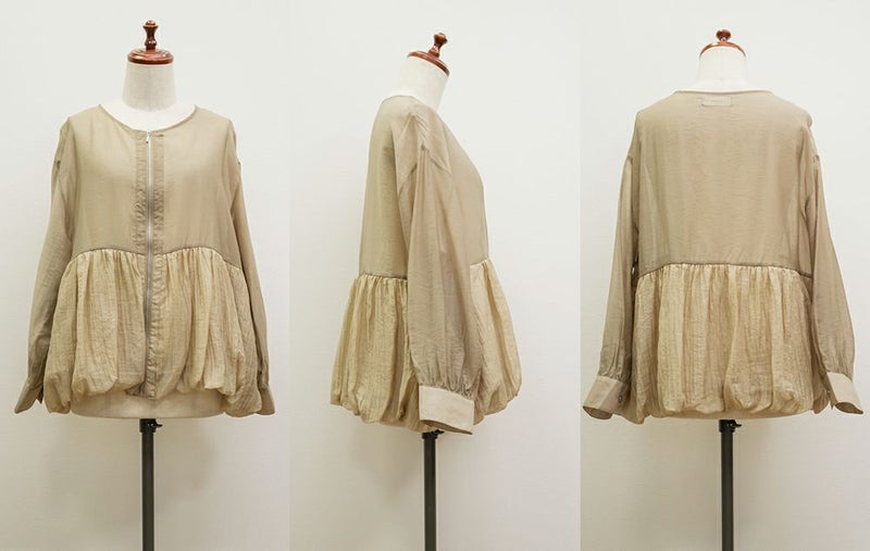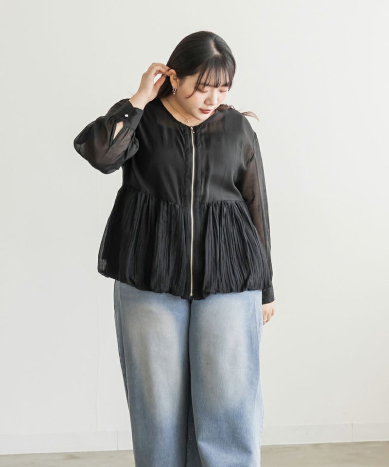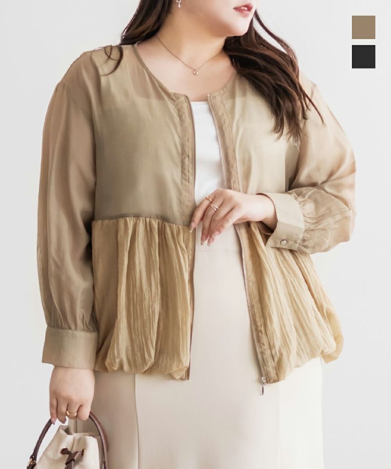 3Lサイズを着用しました! 軽やかでさらっとした素材が心地よく、ロングシーズン着回しできる1枚です。暑い秋でも季節感のある着こなしが出来ます◎ ジップを閉じればトップス風に、開ければ羽織としても使えるので、着こなしの幅がぐっと広がります。 ウエスト切替にギャザーがたっぷり入っていて、ふんわりと広がるペプラムシルエットが女性らしさを引き立ててくれるのもポイントです!ヒップにかかるくらいの丈感で、パンツにもスカートにも合わせやすいのが嬉しい♪ ジップを閉じるとすっきりした印象になり、ハイウエスト位置でメリハリがつくので、スタイルアップ効果も。 オンオフどちらでも活躍する、大人っぽくこなれ感のあるブルゾンです!