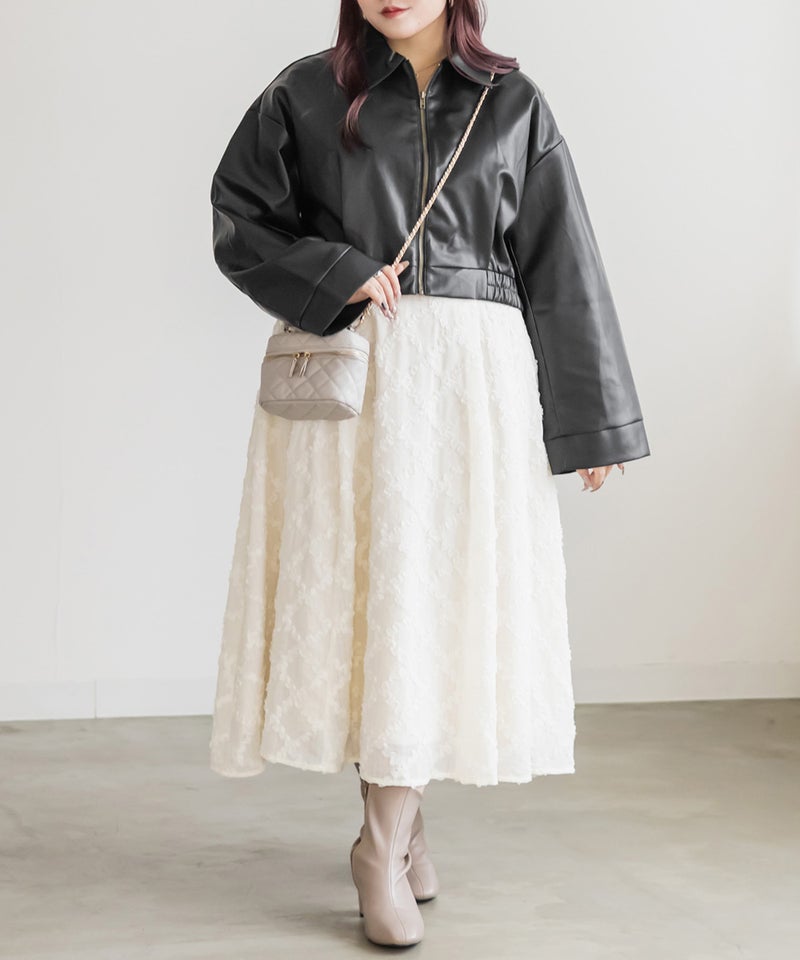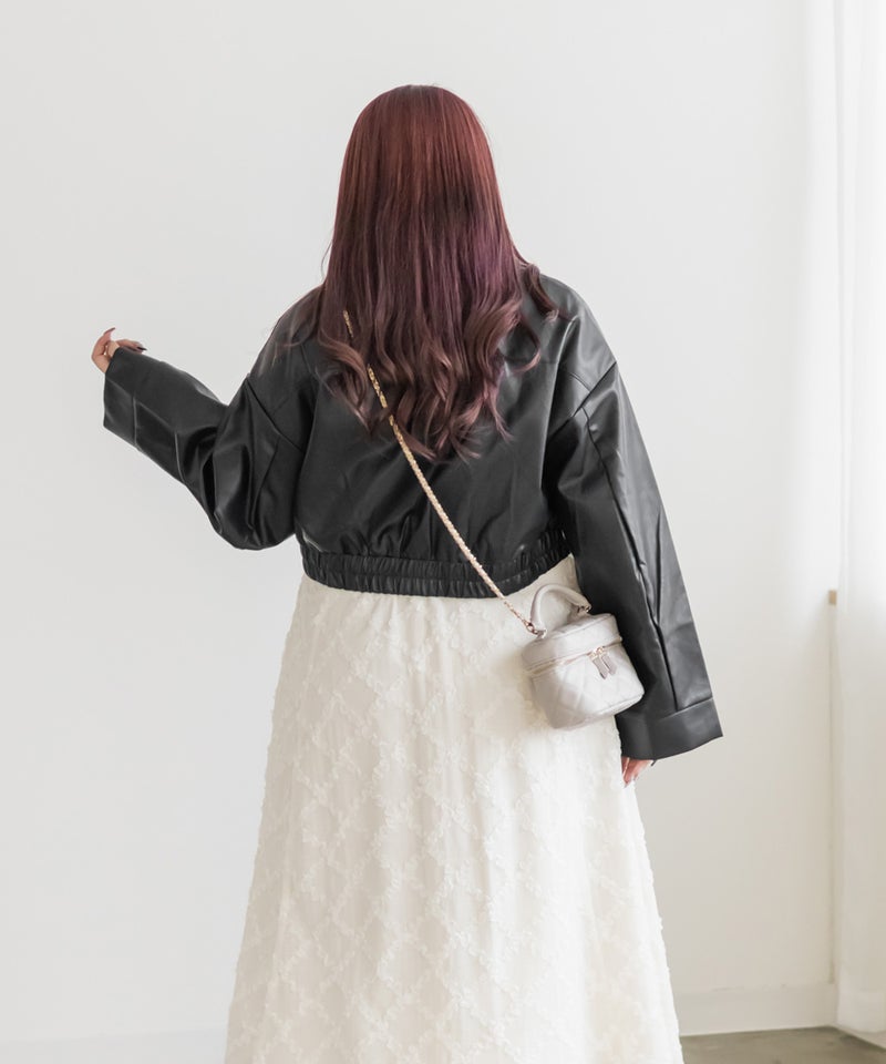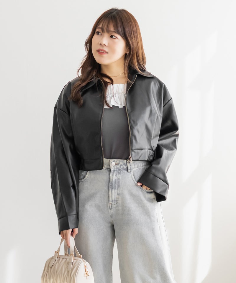 3Lサイズを着用してちょうどいいサイズ感でした!かなり短丈なので、スタイル良く見えました♪トレンドのレザージャケットは1枚は持っておきたいアイテムです◎ポケットが左右に施されていて機能性も抜群です。春秋の軽めの羽織としても、時期に合わせてリブハイネックやニットをインナーに着たりして、ロングシーズン使いやすいのもポイントです!ハイウエストのボトムやワンピースと相性良くスタイリングできます◎
