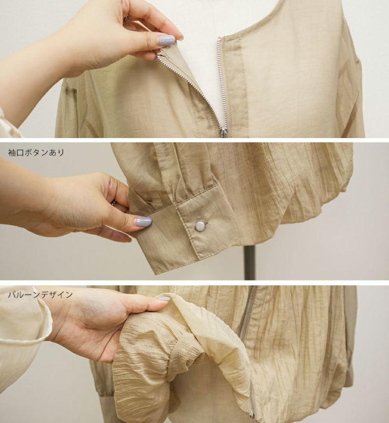 3Lサイズを着用しました! 軽やかでさらっとした素材が心地よく、ロングシーズン着回しできる1枚です。暑い秋でも季節感のある着こなしが出来ます◎ ジップを閉じればトップス風に、開ければ羽織としても使えるので、着こなしの幅がぐっと広がります。 ウエスト切替にギャザーがたっぷり入っていて、ふんわりと広がるペプラムシルエットが女性らしさを引き立ててくれるのもポイントです!ヒップにかかるくらいの丈感で、パンツにもスカートにも合わせやすいのが嬉しい♪ ジップを閉じるとすっきりした印象になり、ハイウエスト位置でメリハリがつくので、スタイルアップ効果も。 オンオフどちらでも活躍する、大人っぽくこなれ感のあるブルゾンです!