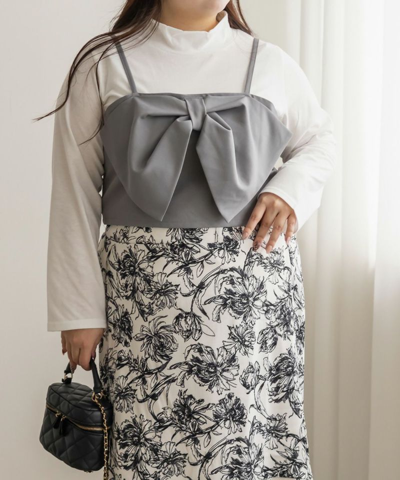 3Lサイズを着用していつもどおりのサイズ選びで問題なさそうでした!ビスチェは後ろゴム入りだけど生地自体は伸びないのでバストサイズの確認をお勧めします◎トップスとビスチェのセットでそれぞれ別のアイテムと合わせて着ても可愛いです!トップスはリブカットソーでらくちんな着心地です!大きめのリボンが目を惹くアイテムで、ガーリーなスタイルになれちゃう1枚です!ビスチェと同じ生地のパンツとセットアップで着てもお洒落な雰囲気になれてお勧めです♪