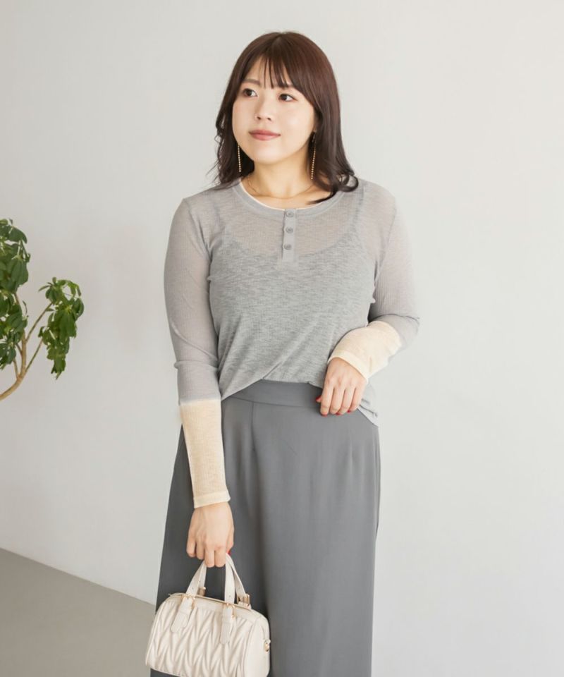 3Lサイズを着てちょうどよい着心地でした。やわらかく軽いさらっとした生地で、窮屈感も全くなく着られます◎透け感があって長袖でも涼しく着られるので、秋らしい着こなしにピッタリです!1枚でさりげないアクセントになる重ね着したようなデザインで、今っぽいヘンリーネックが大人っぽくお洒落な雰囲気です。一枚でも様になり、ワンピなどを重ね着しても可愛いと思います♪ボタンを少し開けて、抜け感のある着こなしもおすすめです。